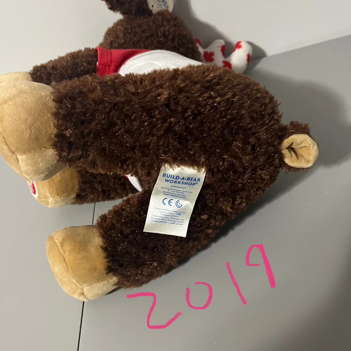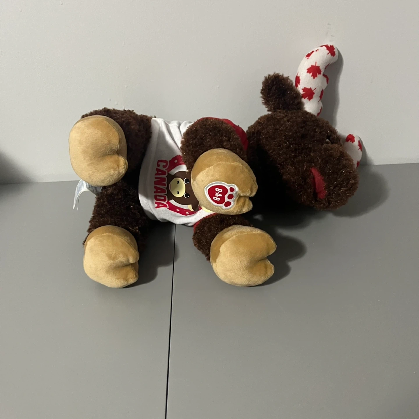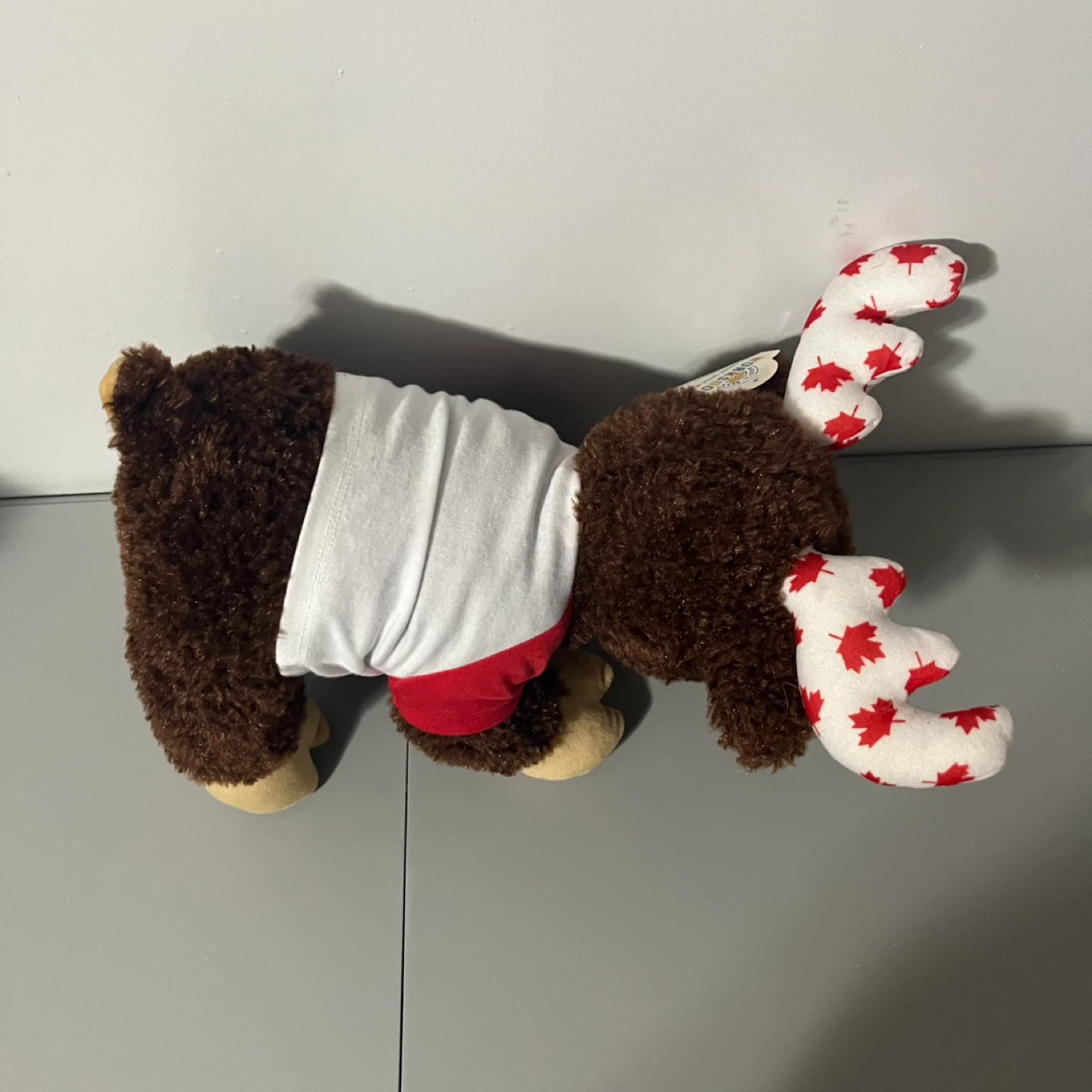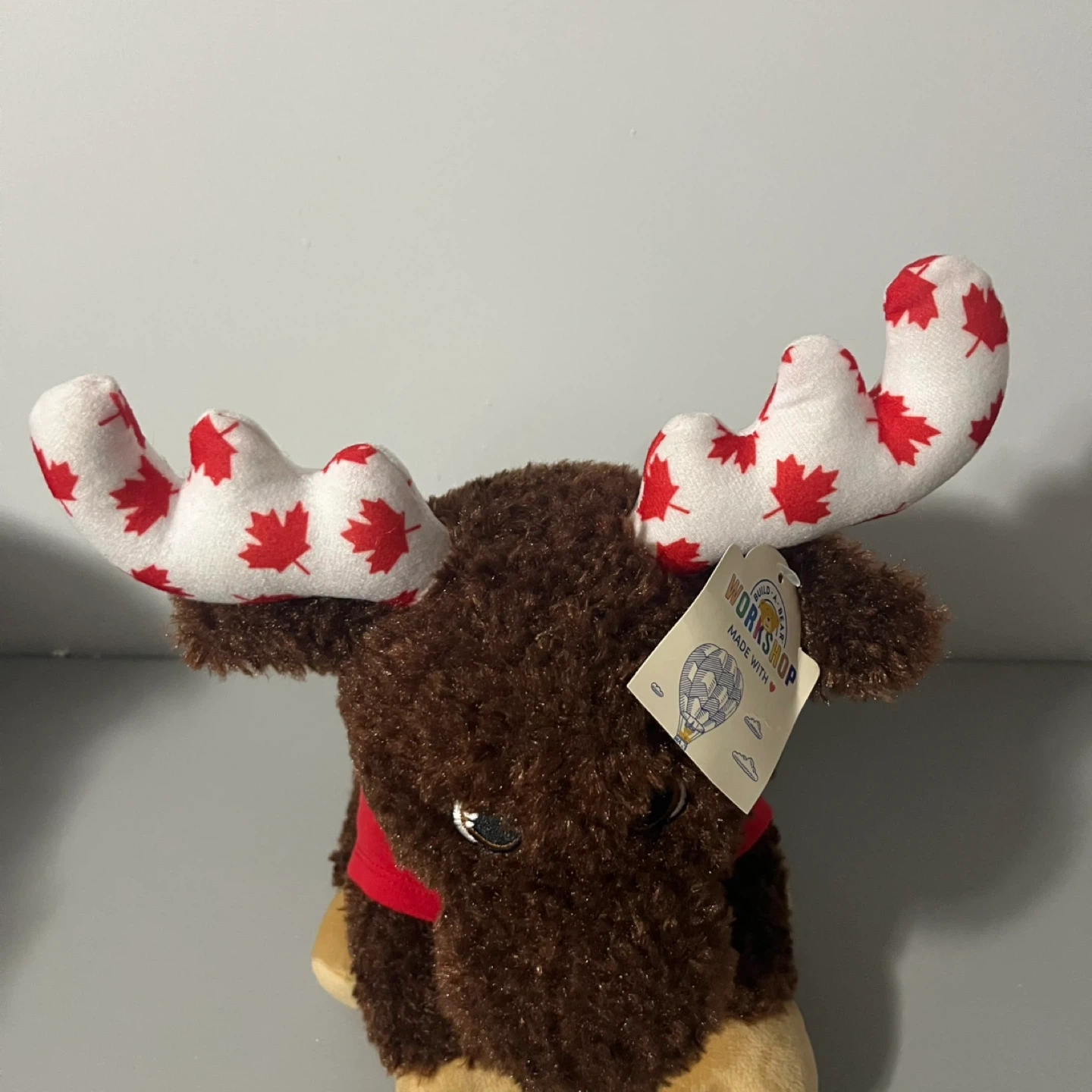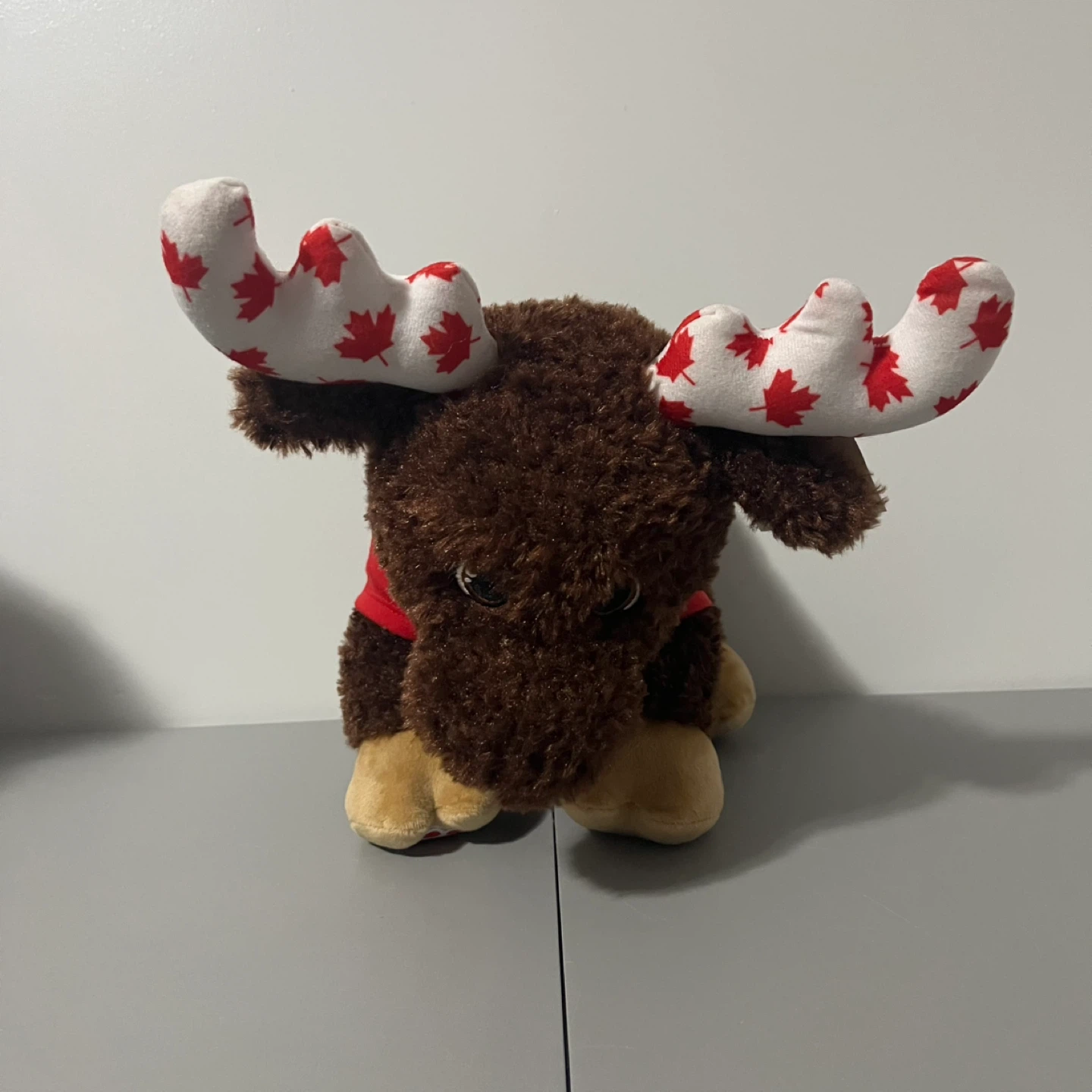Selling a Build-A-Bear moose plush! It's wearing a cute Canada shirt and has antlers with maple leaves. Perfect for anyone who loves Canada or Build-A-Bear collectibles