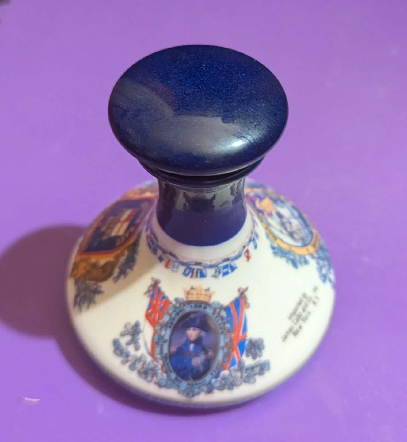 Here's a unique Pusser's Rum ceramic decanter! It's a lovely piece with British Navy themed decorations. The top and neck are a deep blue, complementing the detailed designs around the body of the decanter empty of course π