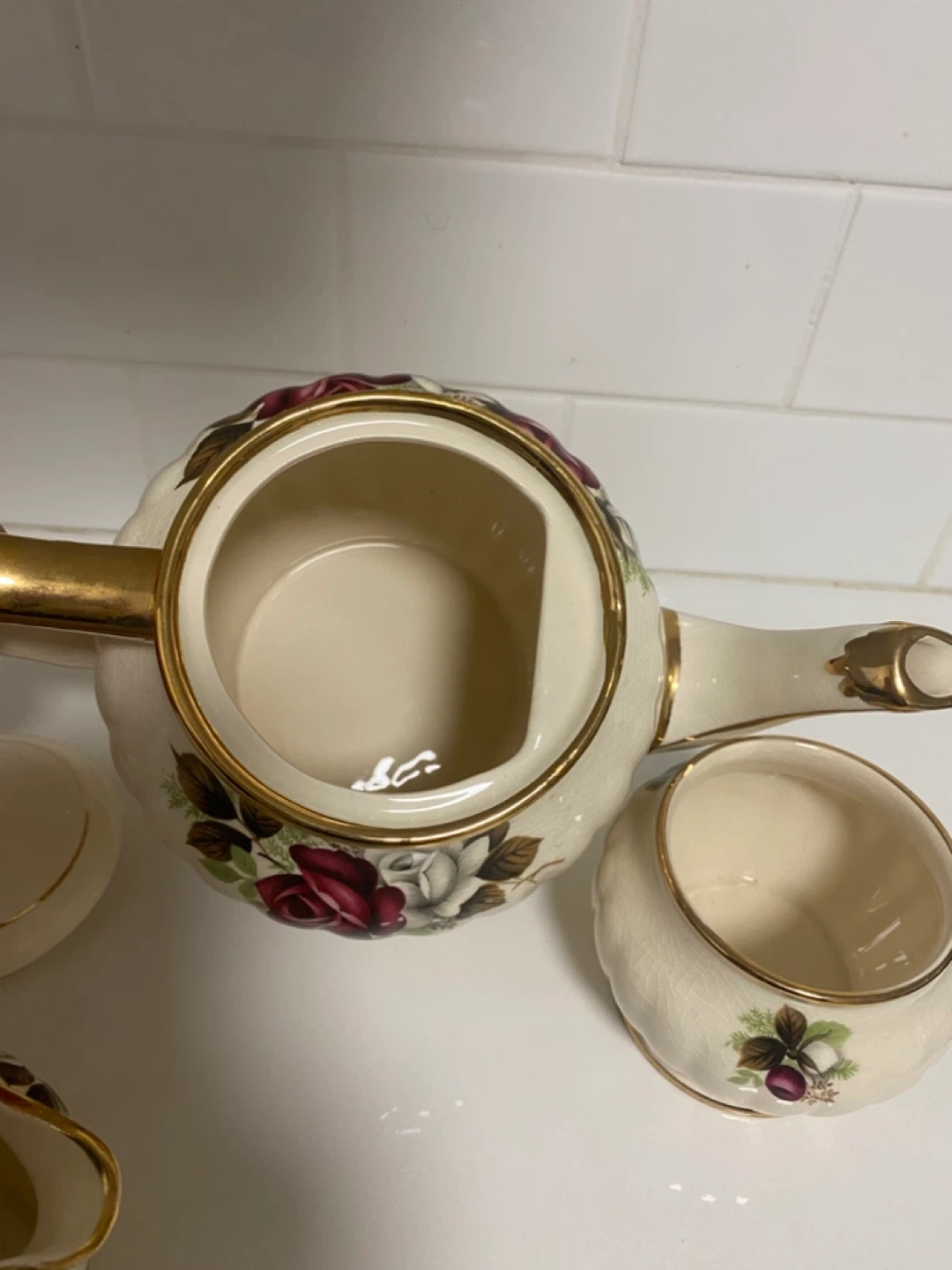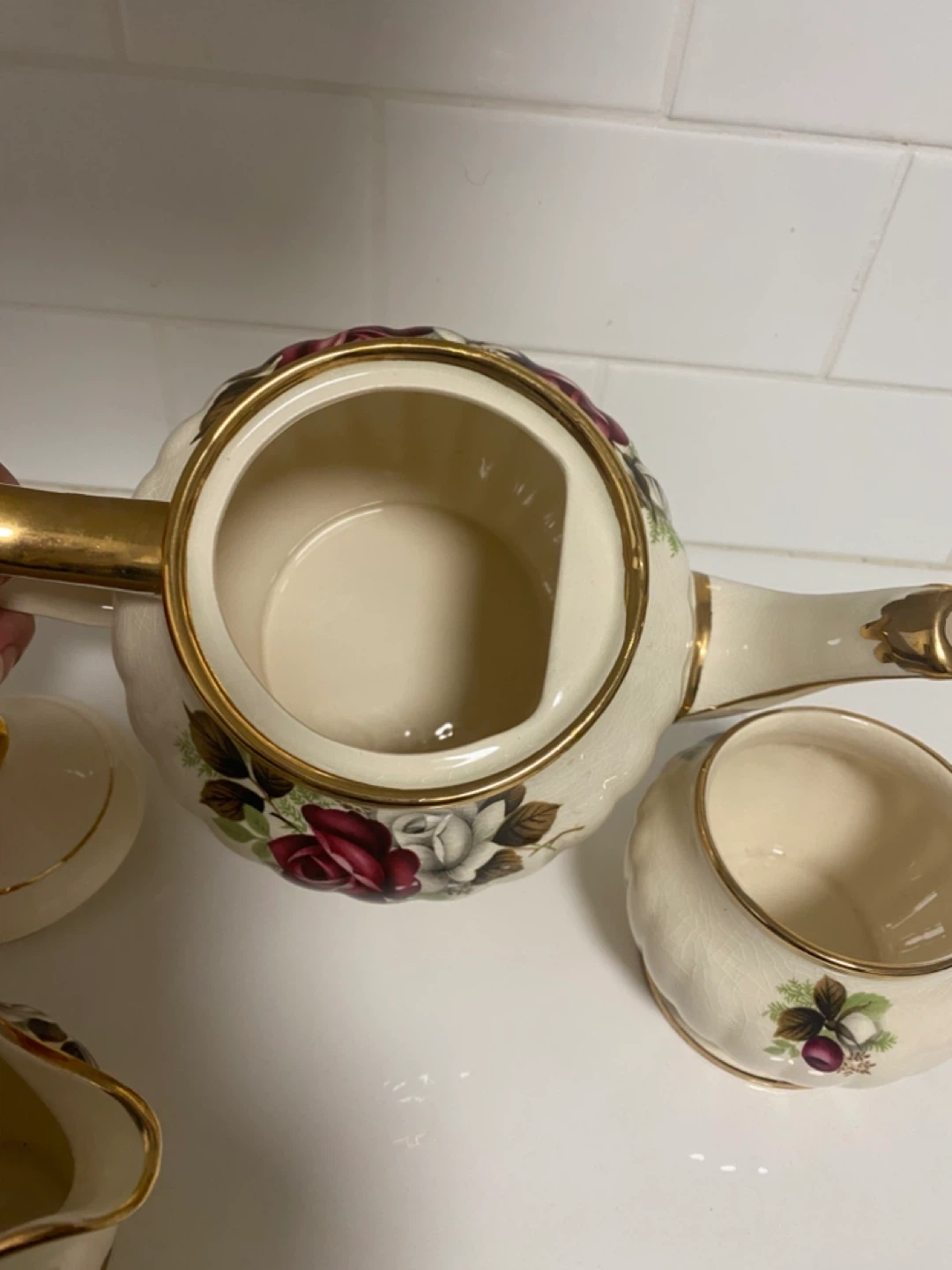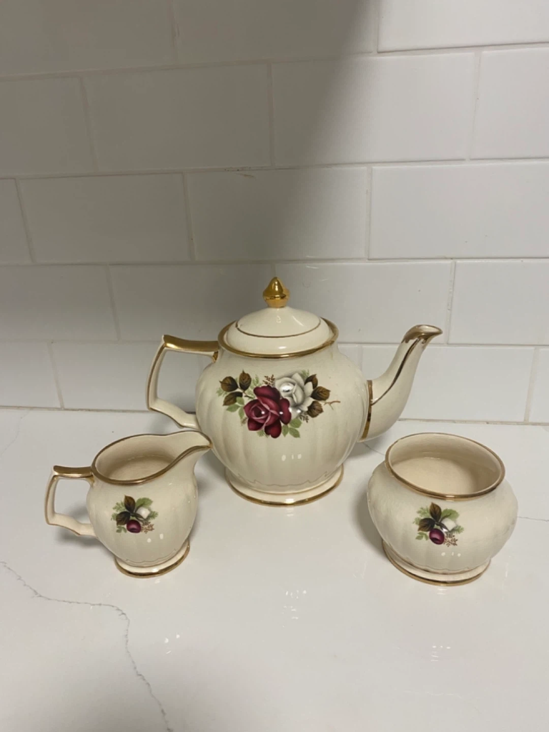 574Selling a charming vintage tea set! It includes a teapot, creamer, and sugar bowl, all adorned with a lovely floral design. Perfect for adding a touch of elegance to your tea time.