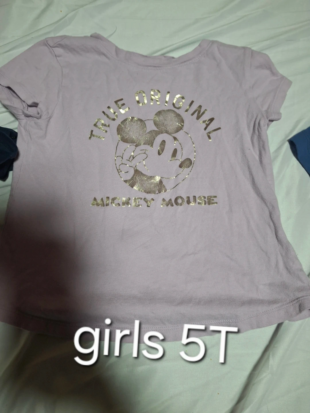 Cute Mickey Mouse t-shirt for girls, size 5T. It's a light purple colour and features a gold 'True Original Mickey Mouse' design