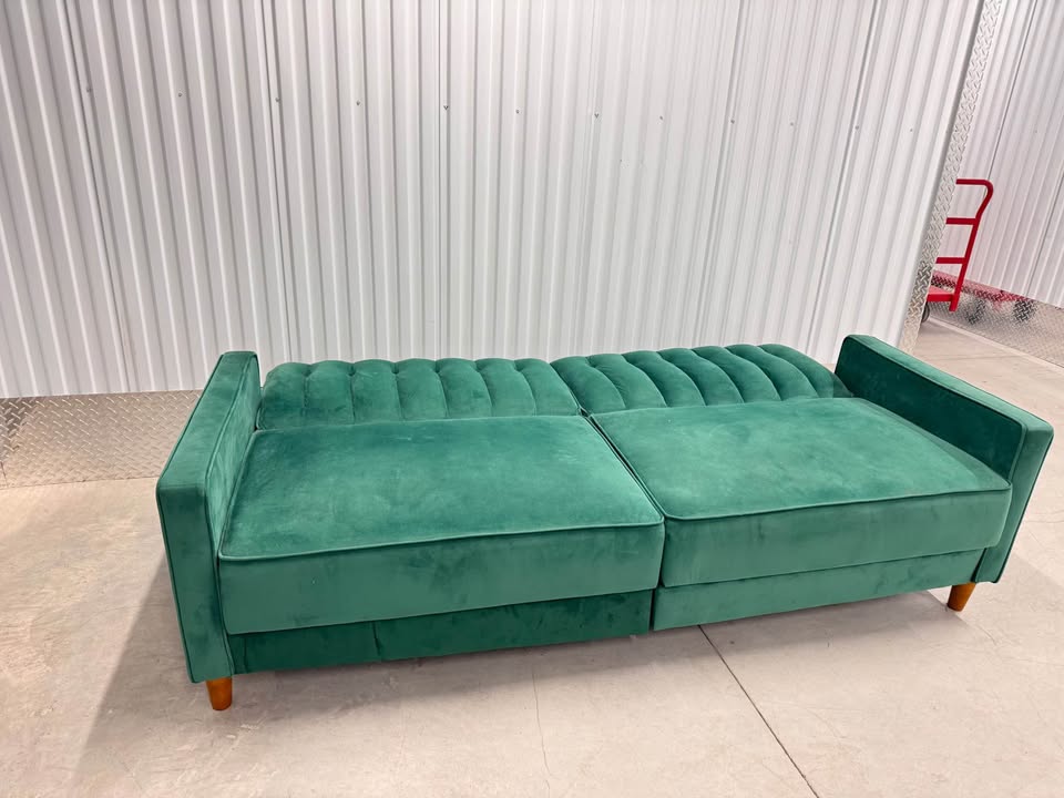 Selling a comfy green velvet sofa! It's in great shape and would look lovely in any living room or den. The velvet material is soft and inviting, perfect for lounging. It's a stylish and practical piece of furniture.