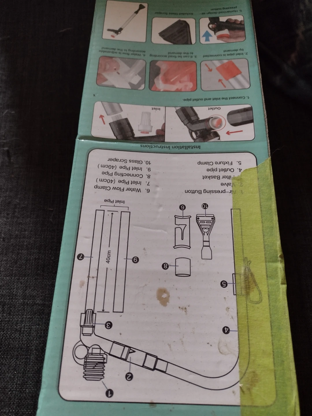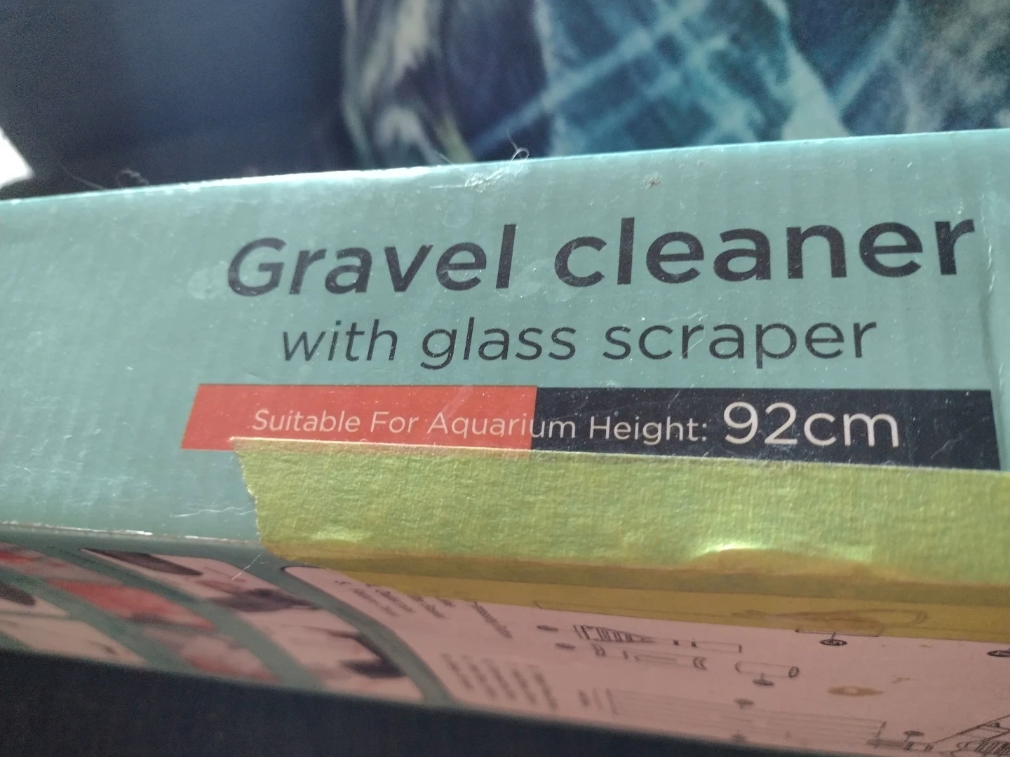 Gravel cleaner with glass scraper, suitable for aquarium height up to 92cm. Comes with installation instructions and all the necessary components: fixture clamp, filter basket, outlet pipe (40cm), inlet pipe (40cm), water flow clamp, and a glass scraper