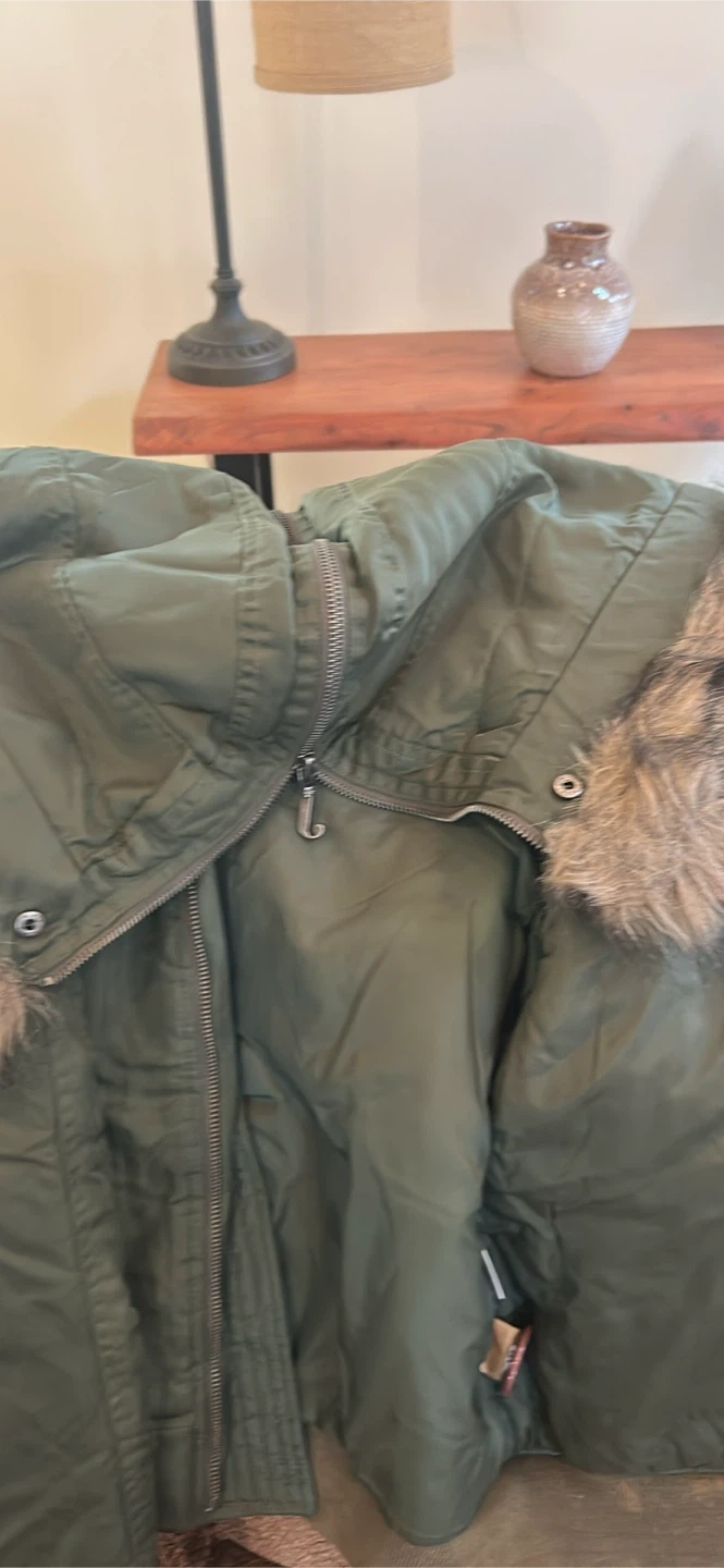 Selling an authentic Juicy Couture winter coat in olive green! It features a faux fur trim and cute heart patch that says "I Love Juicy". It's perfect for staying warm and stylish during the colder months. It was bought in 2001