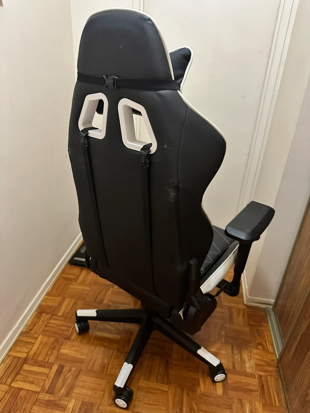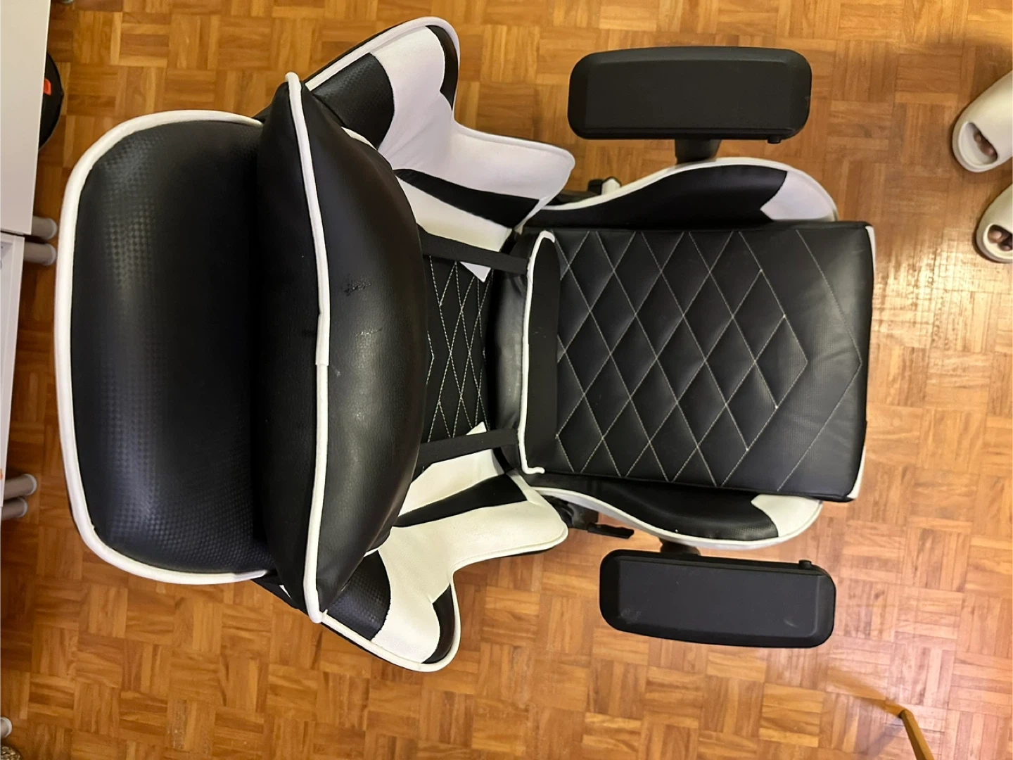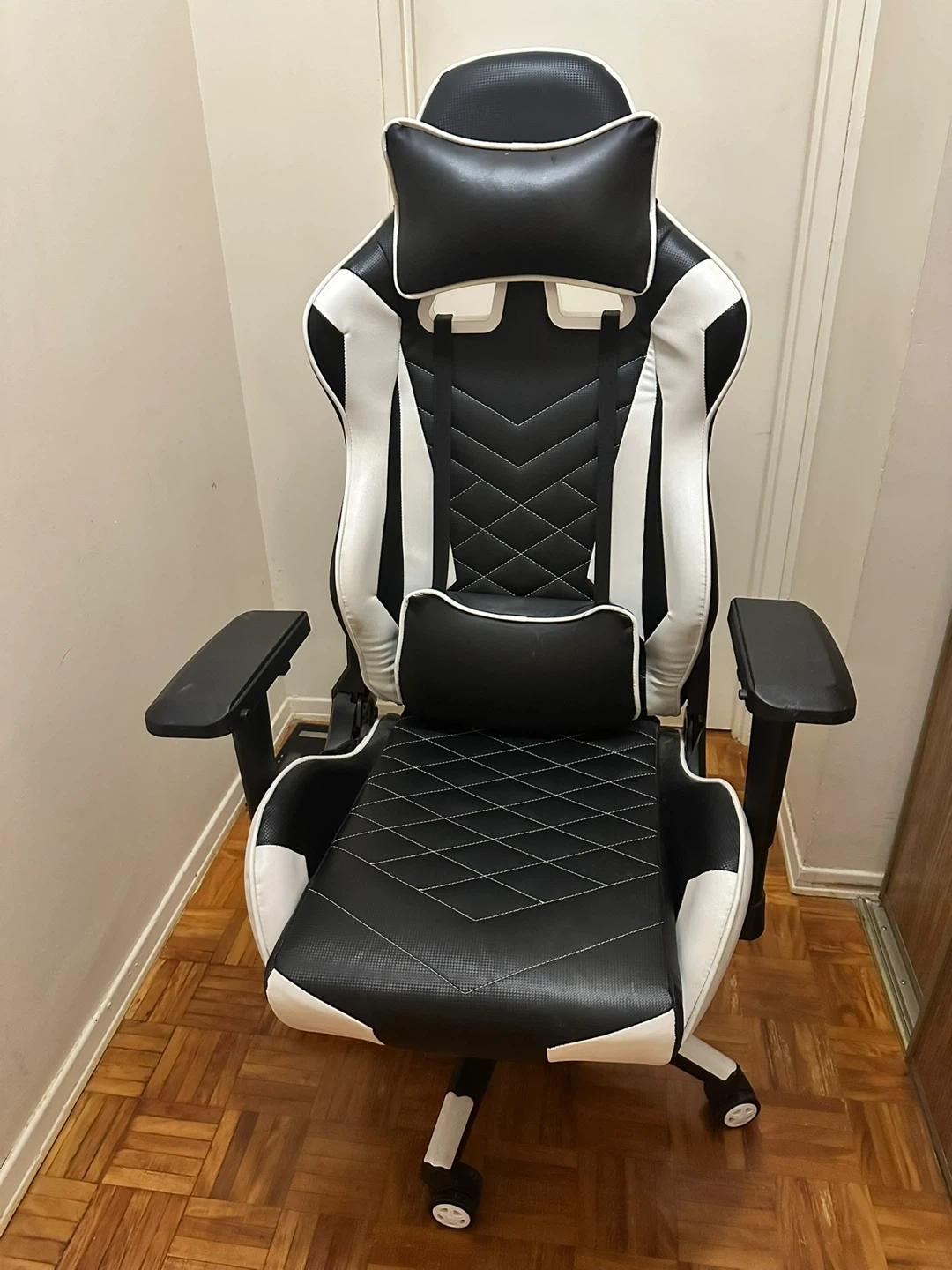 Selling a black and white gaming chair! It's in great shape and super comfy for long gaming sessions or working from home. The design offers good support and looks pretty sleek too!