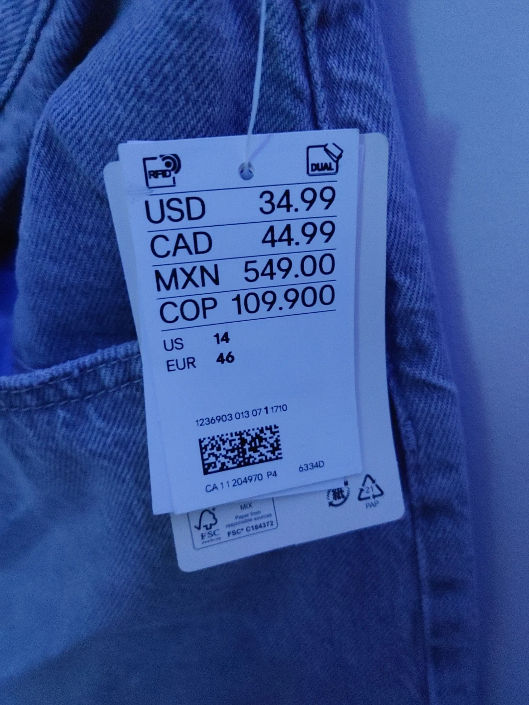 Selling a pair of H&M jeans in US size 14 or EUR size 46. The tag shows they were originally $44.99 CAD