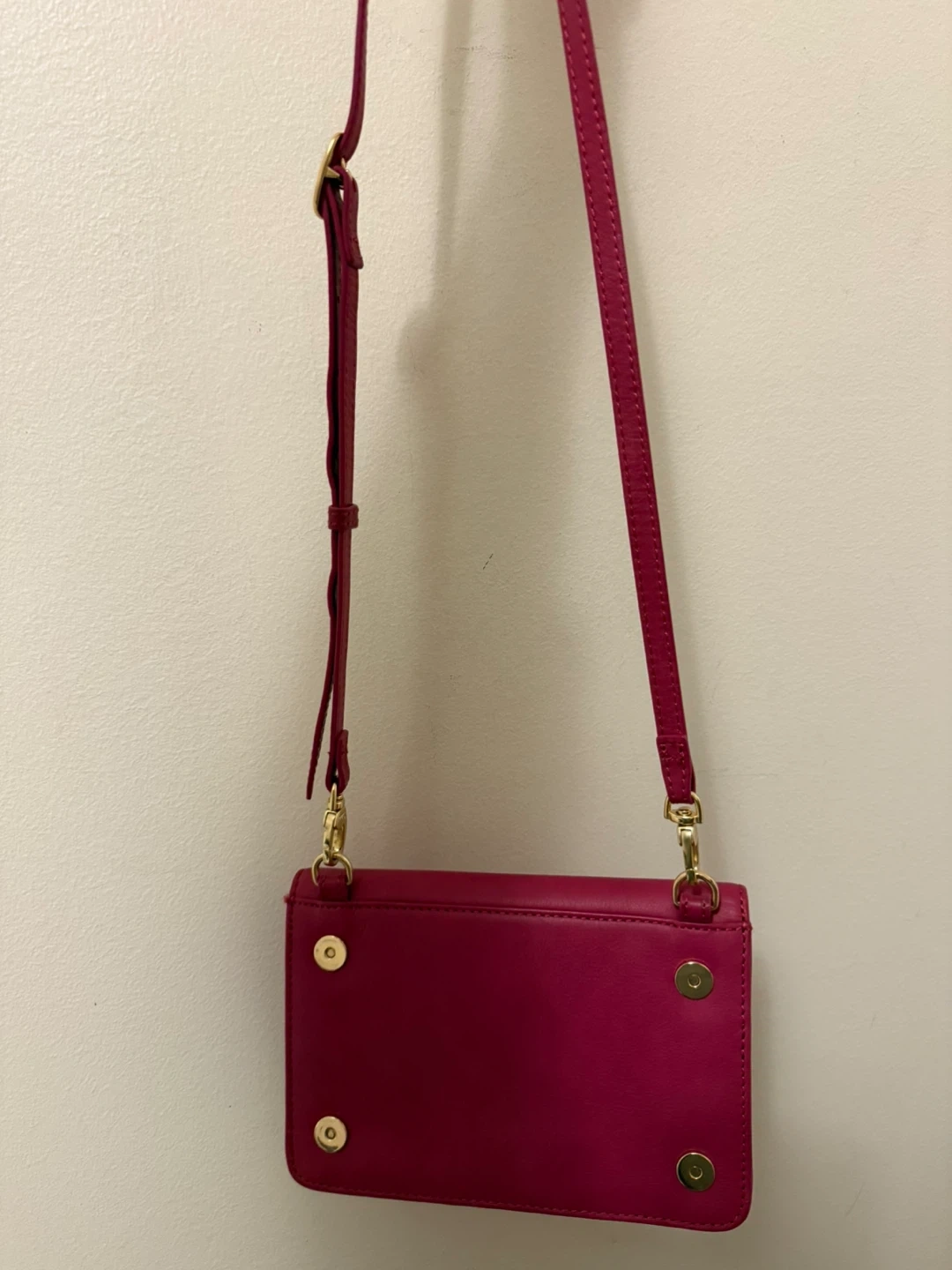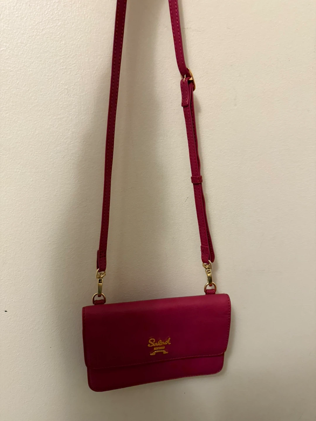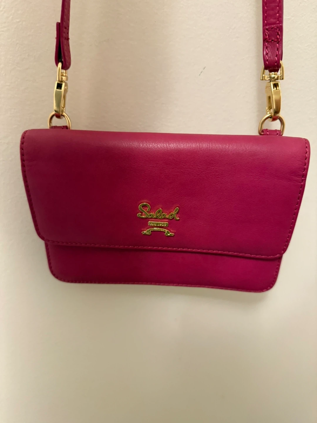A cute Salad brand crossbody bag in a vibrant raspberry colour! It's perfect for carrying your essentials while keeping your hands free