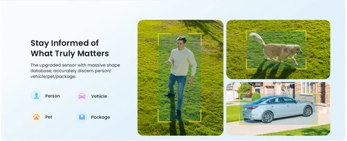 This security camera features a 1/2.9" 2K 3Mega color CMOS sensor, bringing enhanced resolution as well as good dynamic range. This smart camera Intelligently distinguishes people, vehicles, packages and pets from other objects with a powerful human shape database, greatly improving alert accuracy. Once motion is detected, you will get instant notifications, then you can hear and speak to visitors or activate siren and bright spotlights to deter intruders.