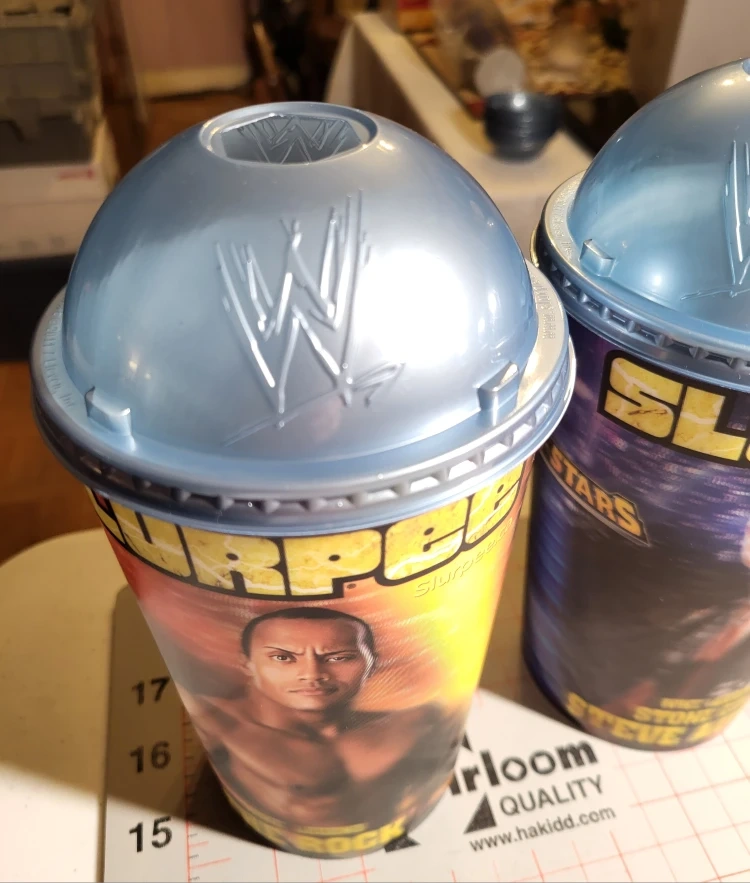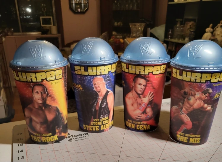 Selling a set of four Slurpee cups featuring WWE All-Stars! Each cup has a different wrestler: Stone Cold Steve Austin, The Rock, The Miz, and John Cena. Great for any wrestling fan or collector! All cups features a lenticular design, giving ~ the image of a sense of depth or motion when viewed from different angles.