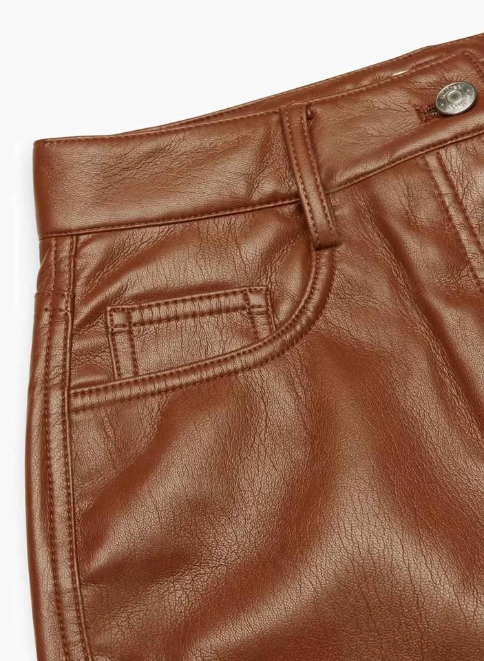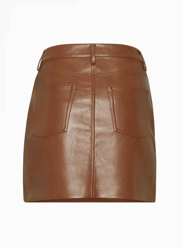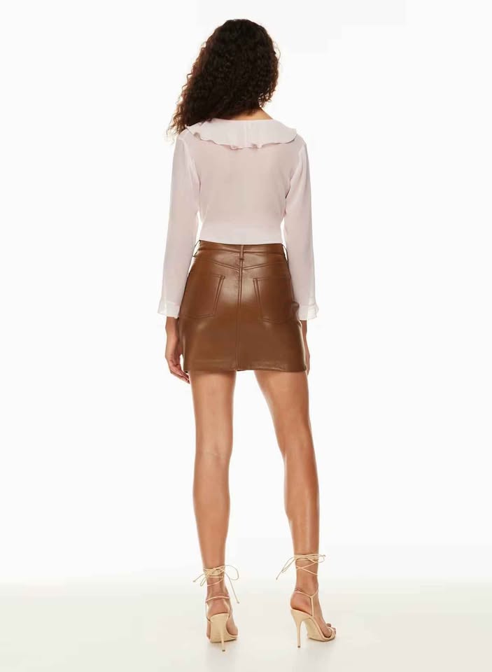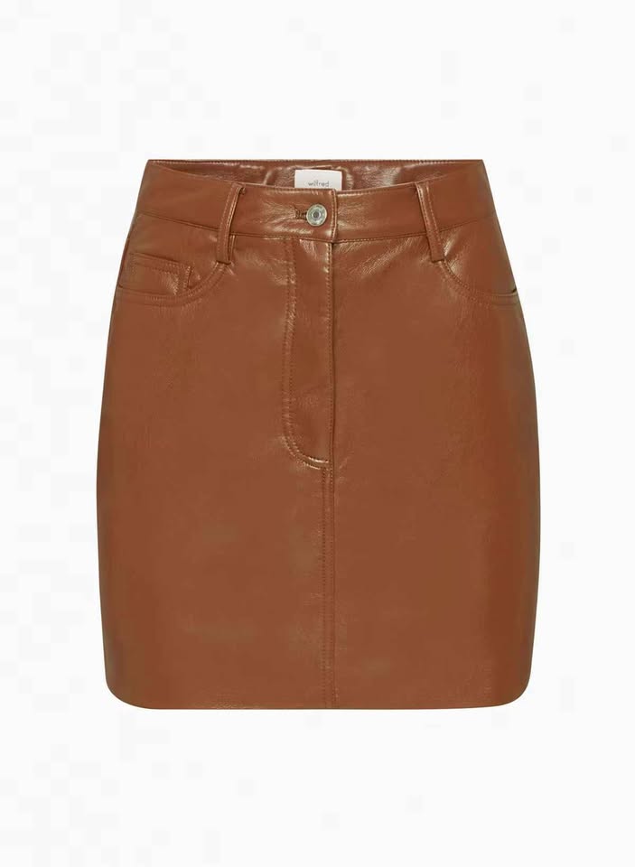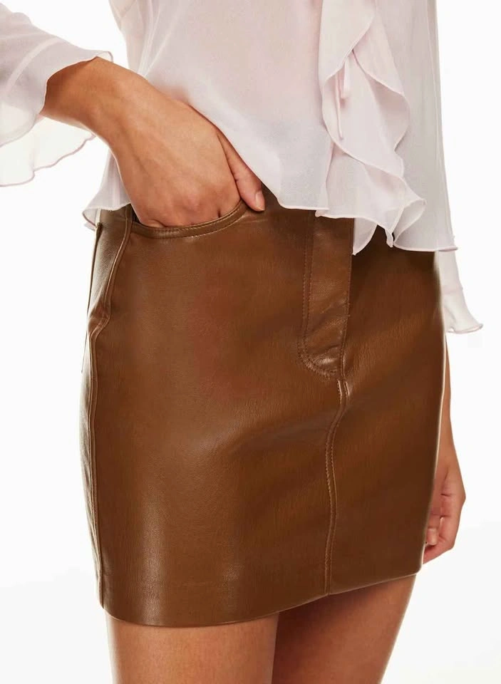This is a high-waisted A-line mini skirt with denim-inspired construction and topstitch detailing. It's made with innovative Vegan Leather that looks and feels like the real thing.
