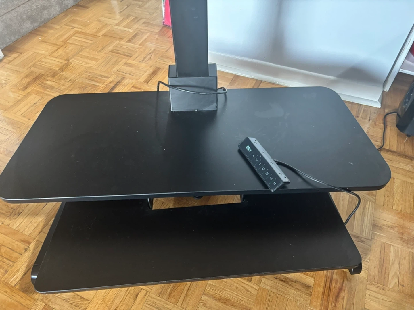 Selling a black adjustable height standing desk. It's in great condition and perfect for working from home. It features an adjustable height, removable attachment for a monitor and the keyboard is adjustable and removable as well. If you're interested, feel free to message me!