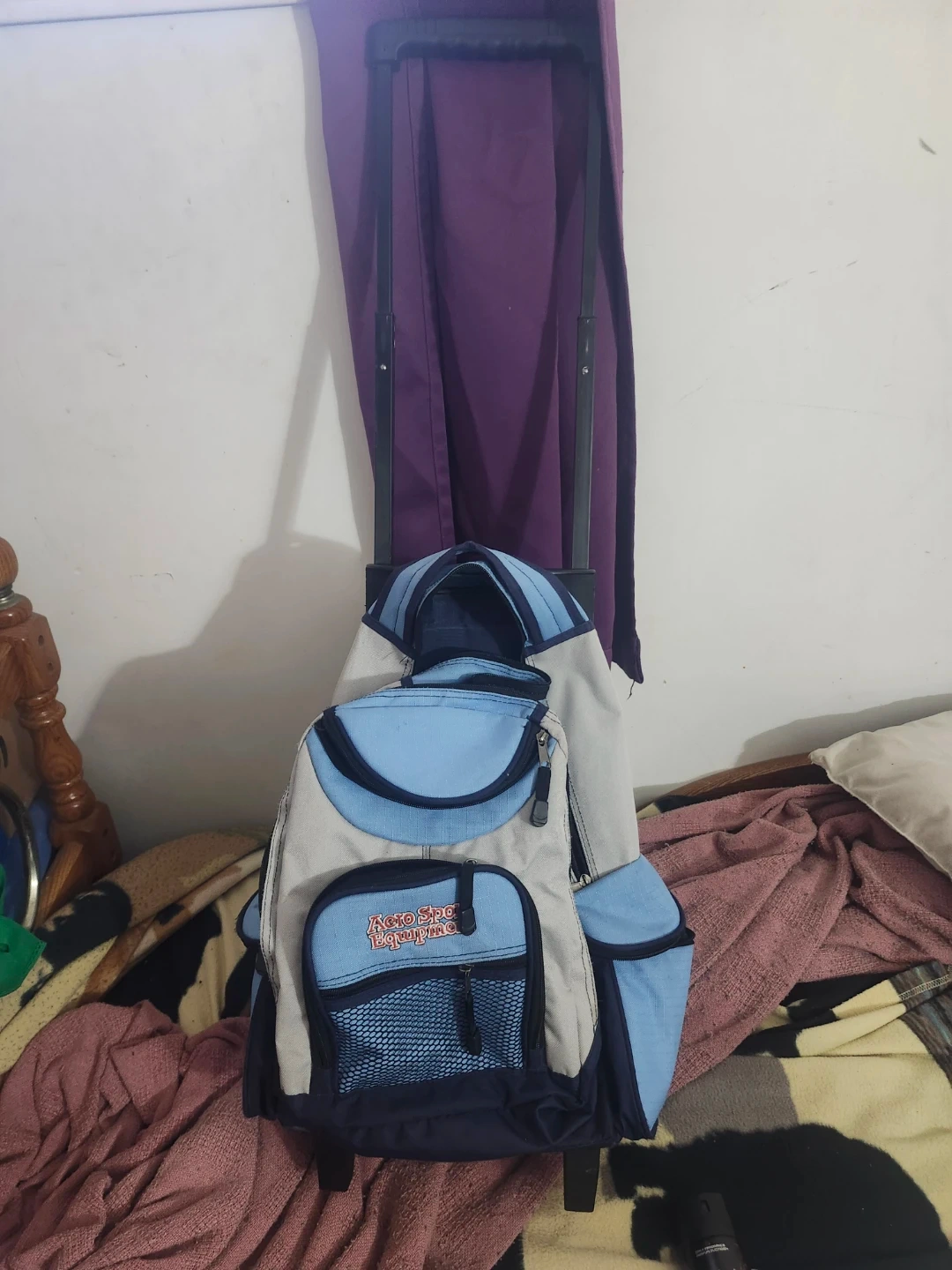 Rolling backpack from Aero Sport Equipme in good condition! Perfect for school or travel, this backpack features a retractable handle and smooth-rolling wheels for easy transport. It has multiple compartments to keep your belongings organized.