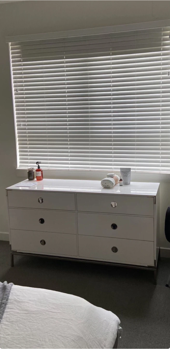 The original fixtures were silver; has been painted gold by the owner to update the look. All drawers are fully functional. The white finish on the dresser still looks like new.