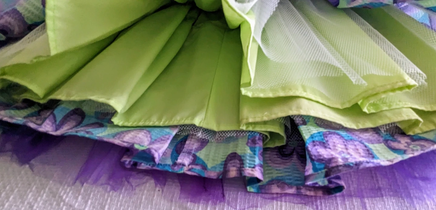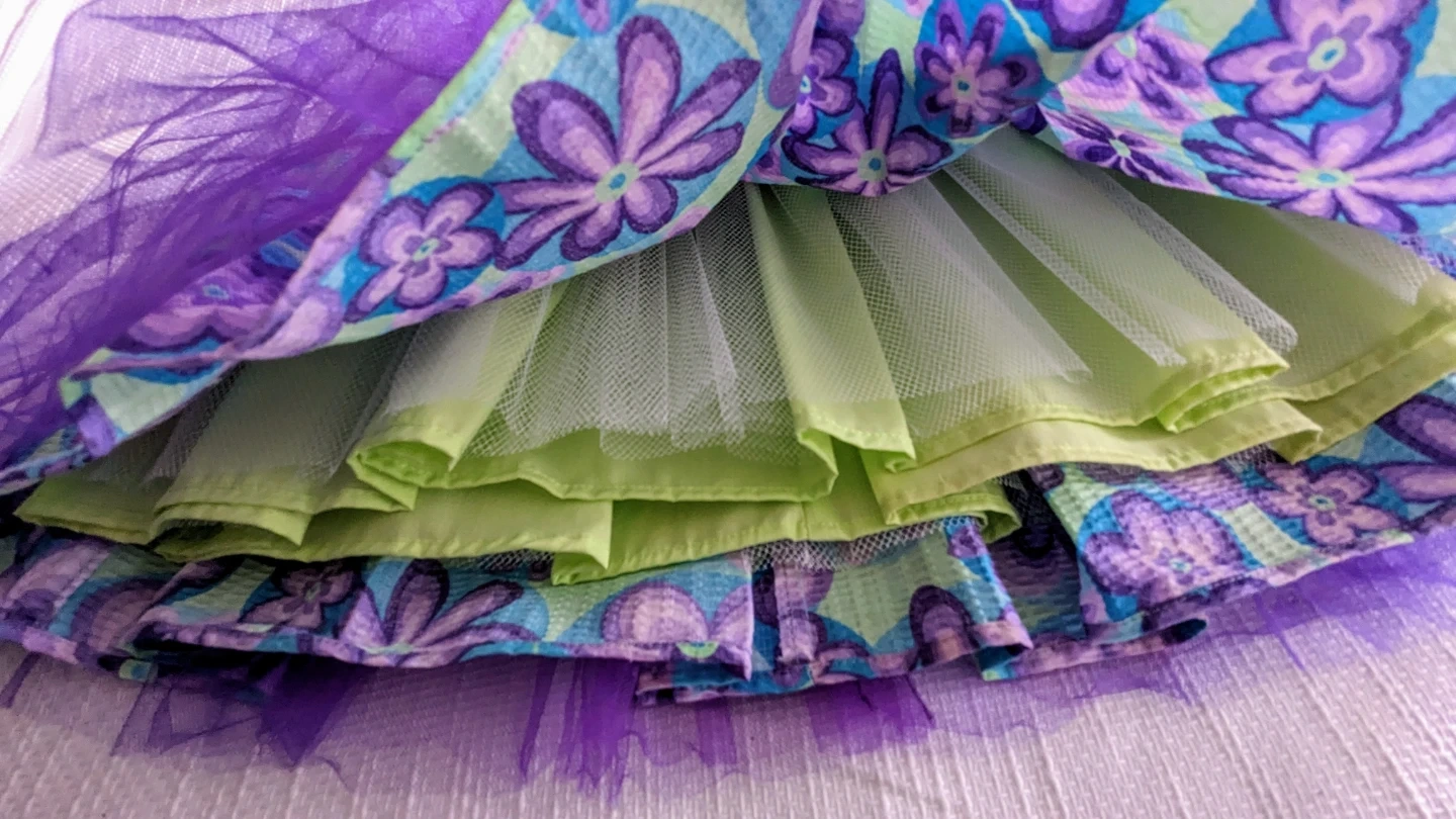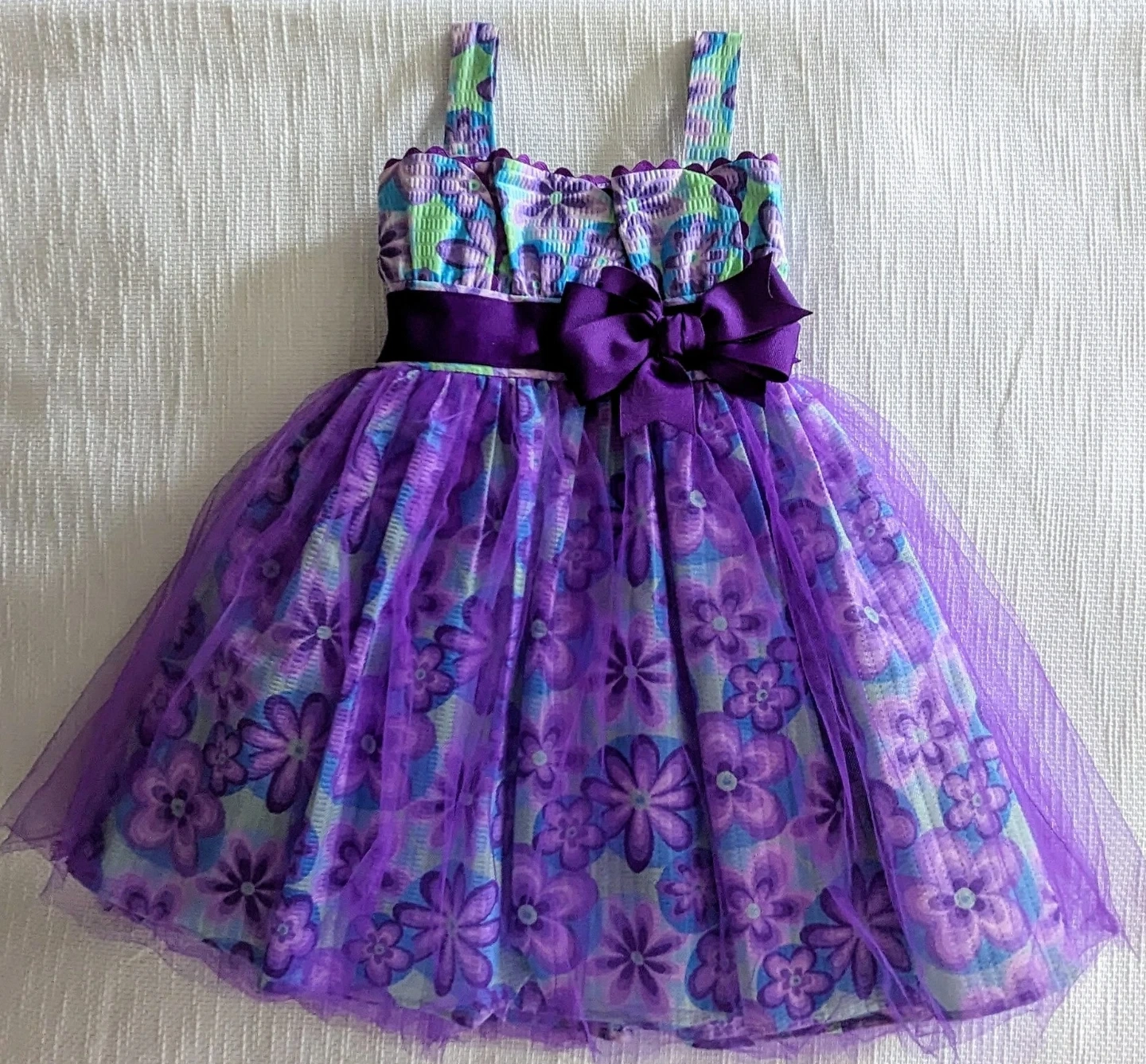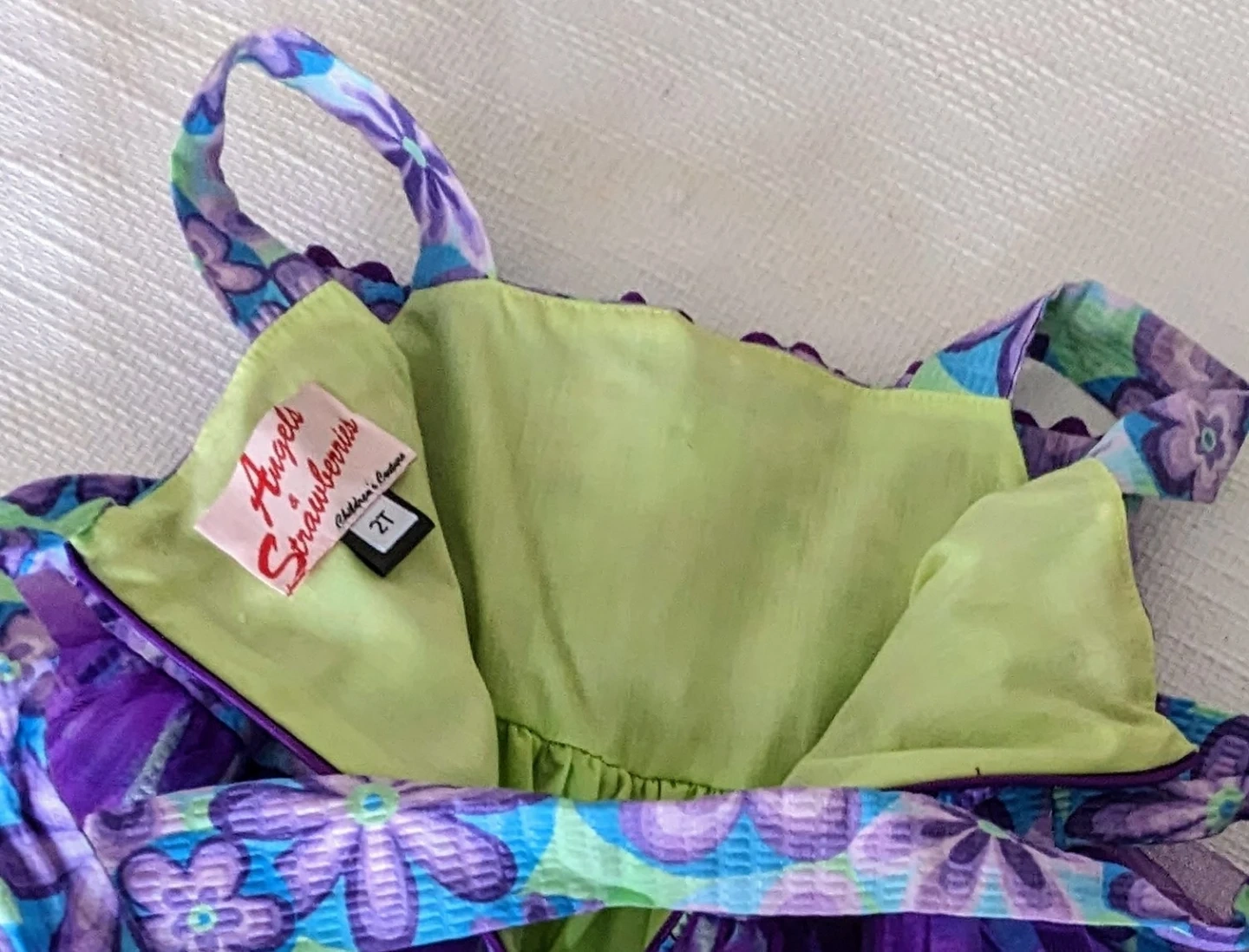 Seersucker Flowers Print Girl Dress Brand new, no tags Beautiful dress with lovely purple flowers on a green background Fabric: Seersucker Size 2T Breast: 22" Long: 21" Features: two layers tulle overskirt. Fully lined Ric Rac trimming Grossgrain ribbon with front bow Back tie Invisible back zipper Dress: 100% cotton Lining: 100%cotton Lining with net ruffle for puffiness Tulle overskirt: rayon/polyester Ric Rac trimming: 100% polyester Brand: Angels & Strawberries Children Couture Machine washable and tumble dry on low Made in New York