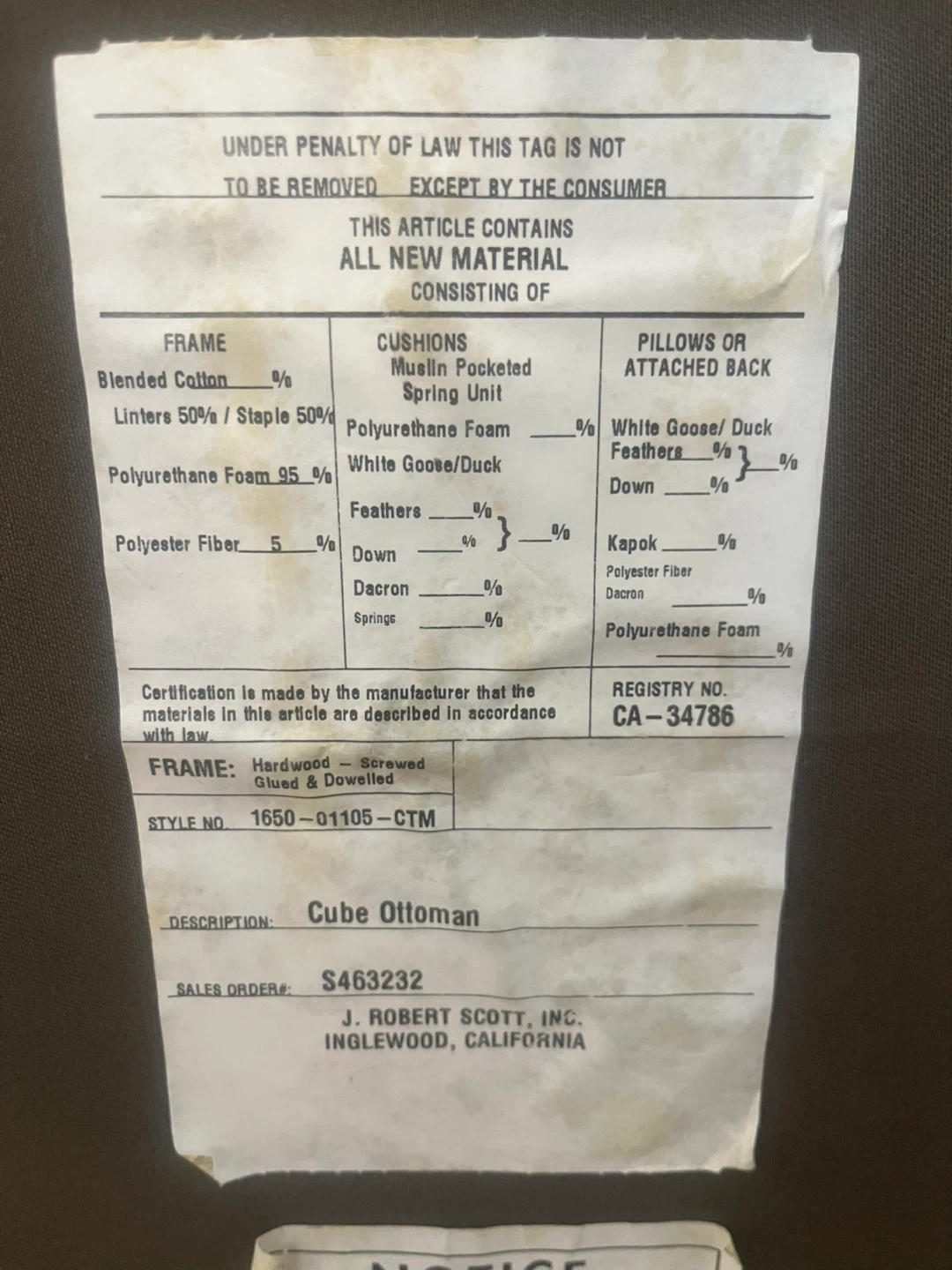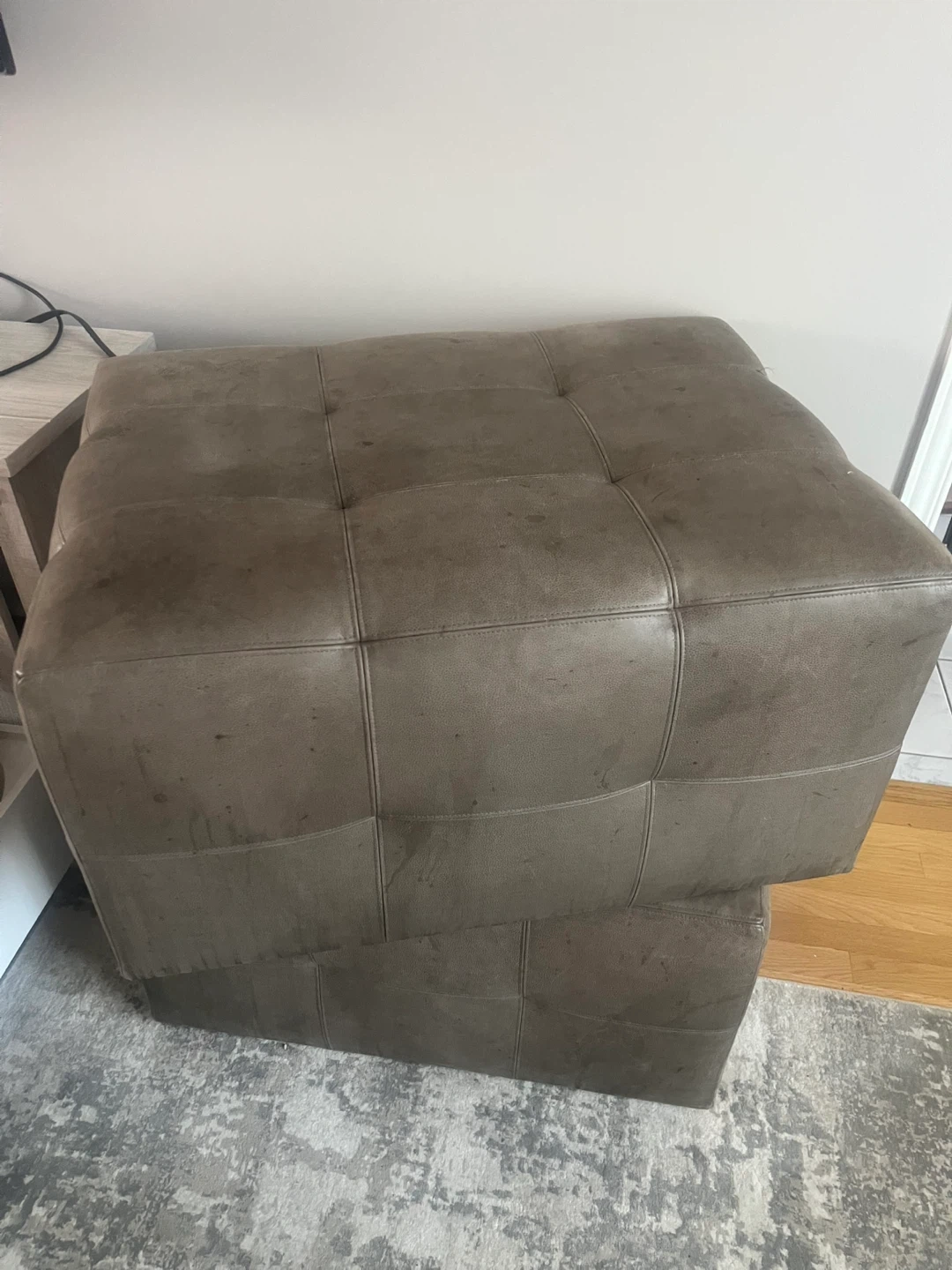 105Selling a cube ottoman in grey. Material: - Frame: Hardwood – Screwed Glued & Dowelled - Cushions: Muslin Pocketed Spring Unit - Pillows or Attached Back: White Goose/Duck Feathers