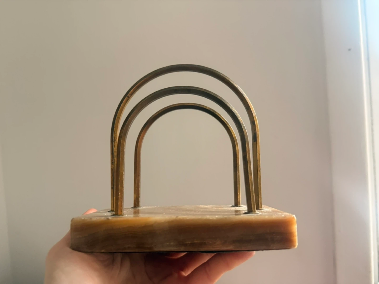 Here's a unique letter holder featuring a marble base and metal arches. It’s perfect for keeping your mail organized with a touch of elegance and style