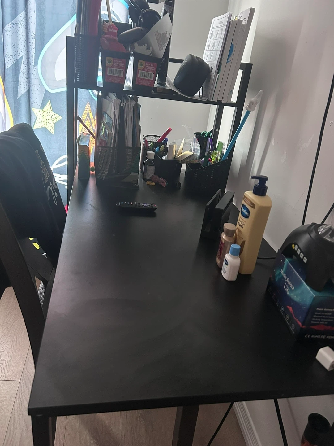 Selling a black computer desk that comes with built-in shelves! It's perfect for keeping your workspace organized and tidy. The desk is in great condition and ready for a new home. It has a sleek, modern look that would fit well in any room