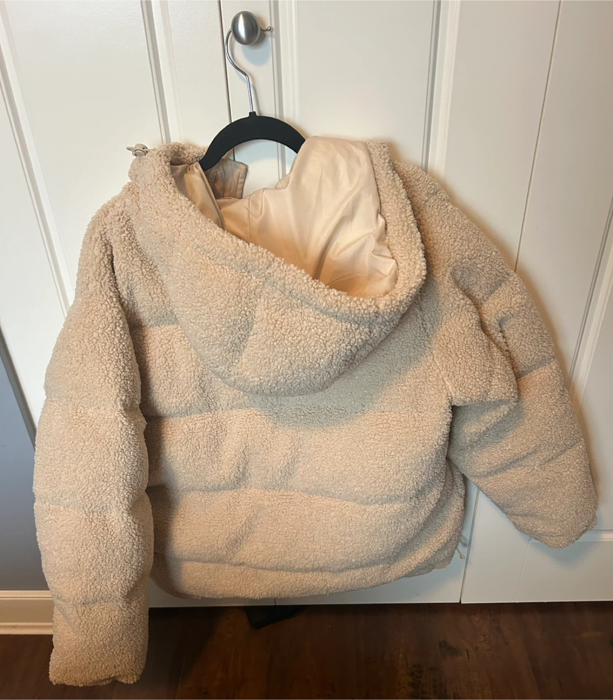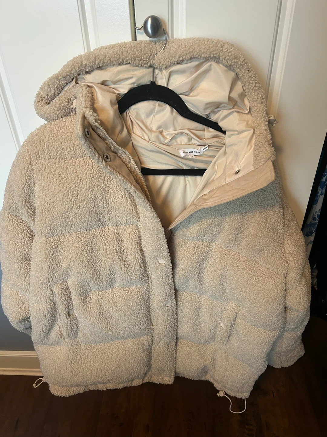 86Good American Women Essentials Sherpa Cocoon Hooded Puffer Coat in Cream. Size US S Good American Size 1. Worn once! Excellent condition! -Oversized slouchy fit - Drawcord hem and hood to wear long or shorter - Heavyweight non stretch quilted sherpa-very warm and cozy - Snap flap and hidden zip placket - Front snap and zip closure - Lined
