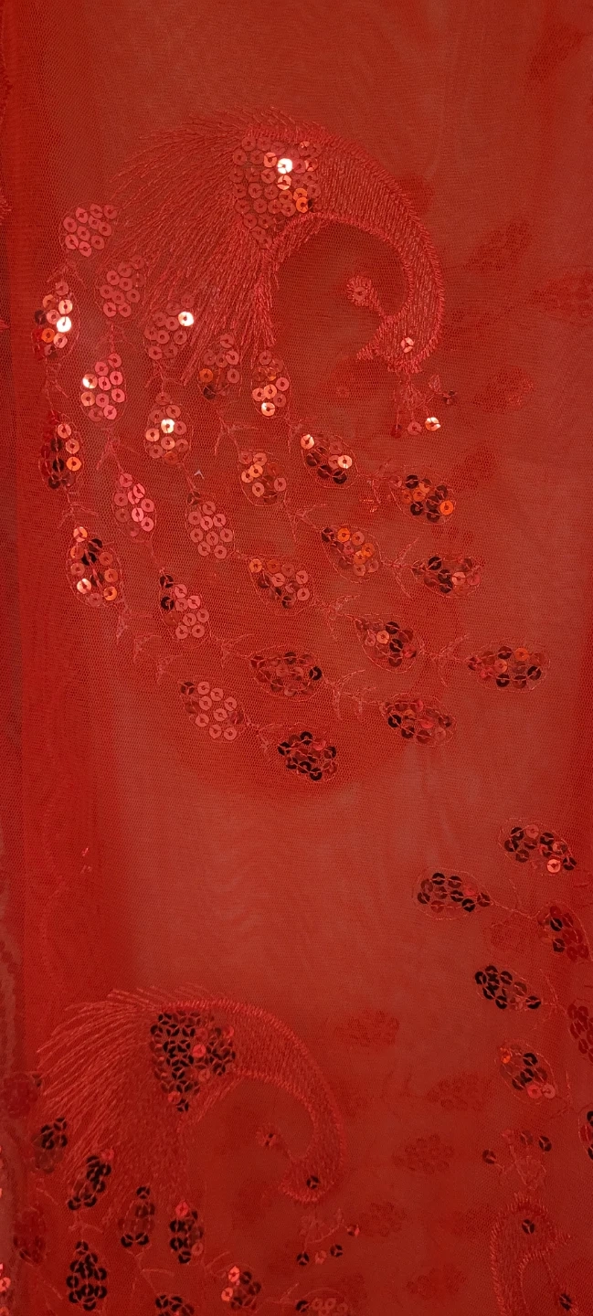 A beautiful red scarf with sequin detailing! Perfect for adding a touch of sparkle to any outfit. It features a delicate fringe and an intricate sequin peacock pattern.