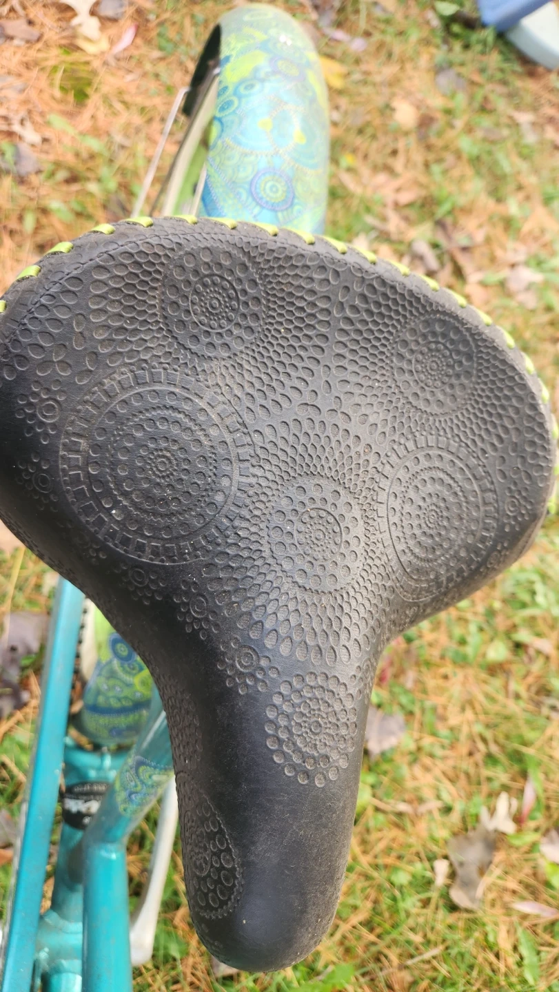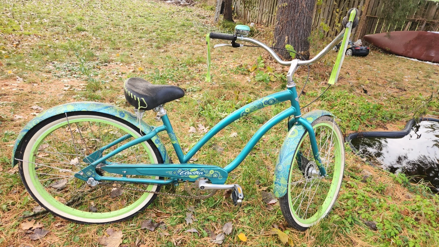 Selling an Electra cruiser bike in a lovely teal blue colour! It's got some unique designs on the frame and fenders that really make it stand out. The seat is black with a cool patterned texture. Ready for some fun rides around town!