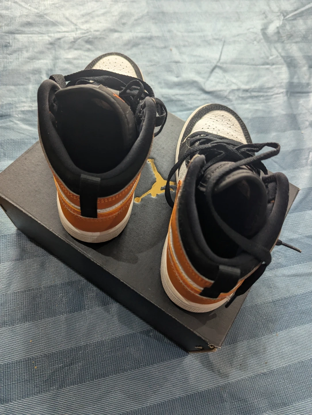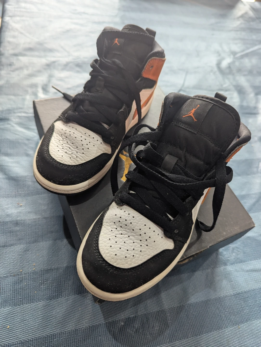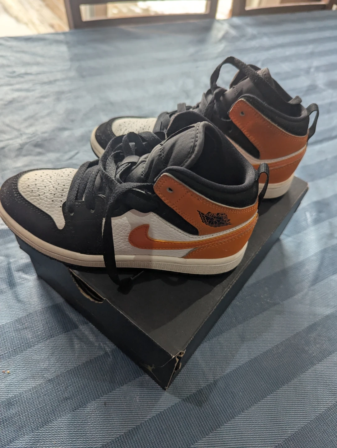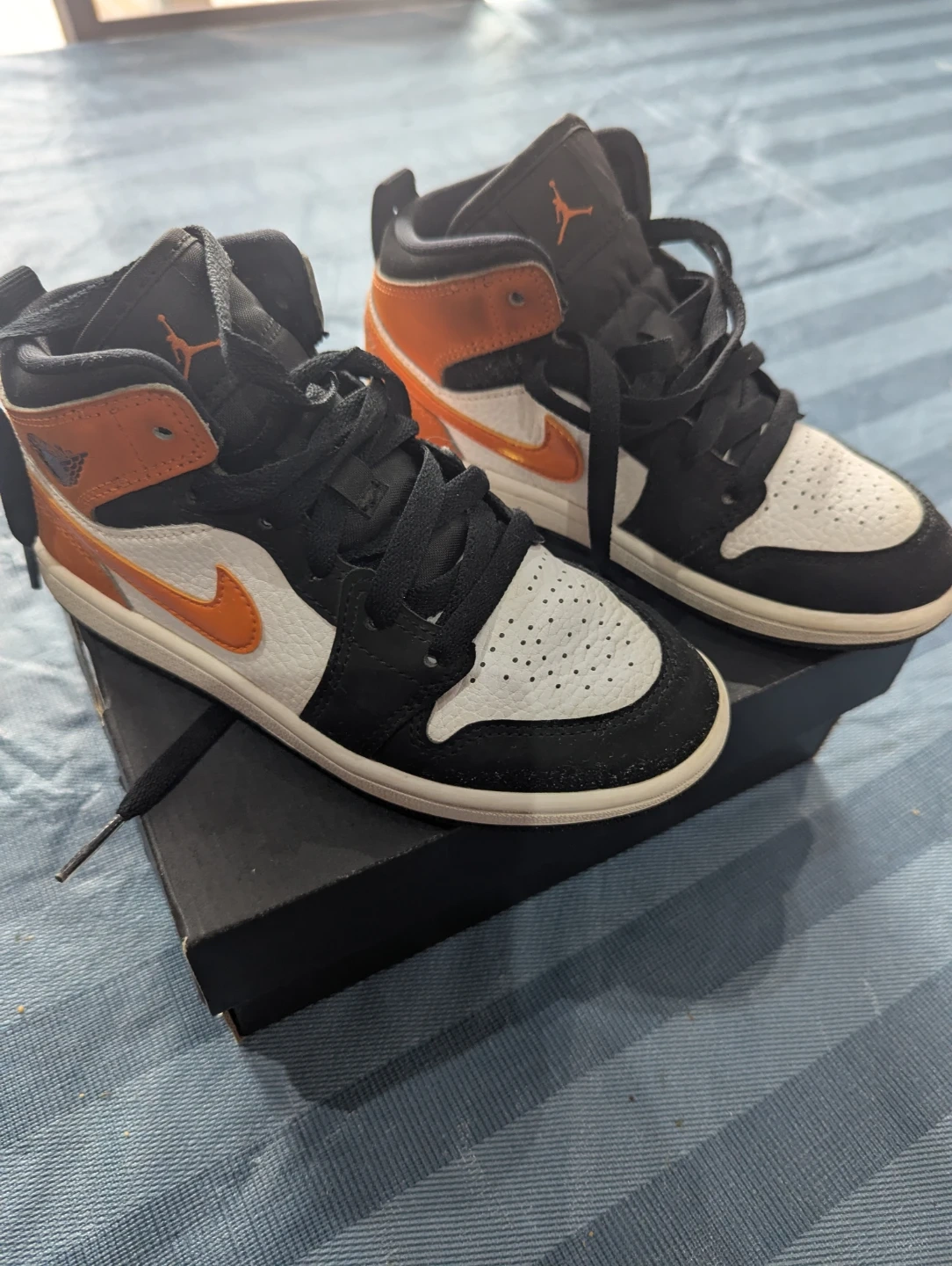 Selling a pair of Air Jordan 1 Mid SE shoes. They are black, white, and orange. Comes with the box!