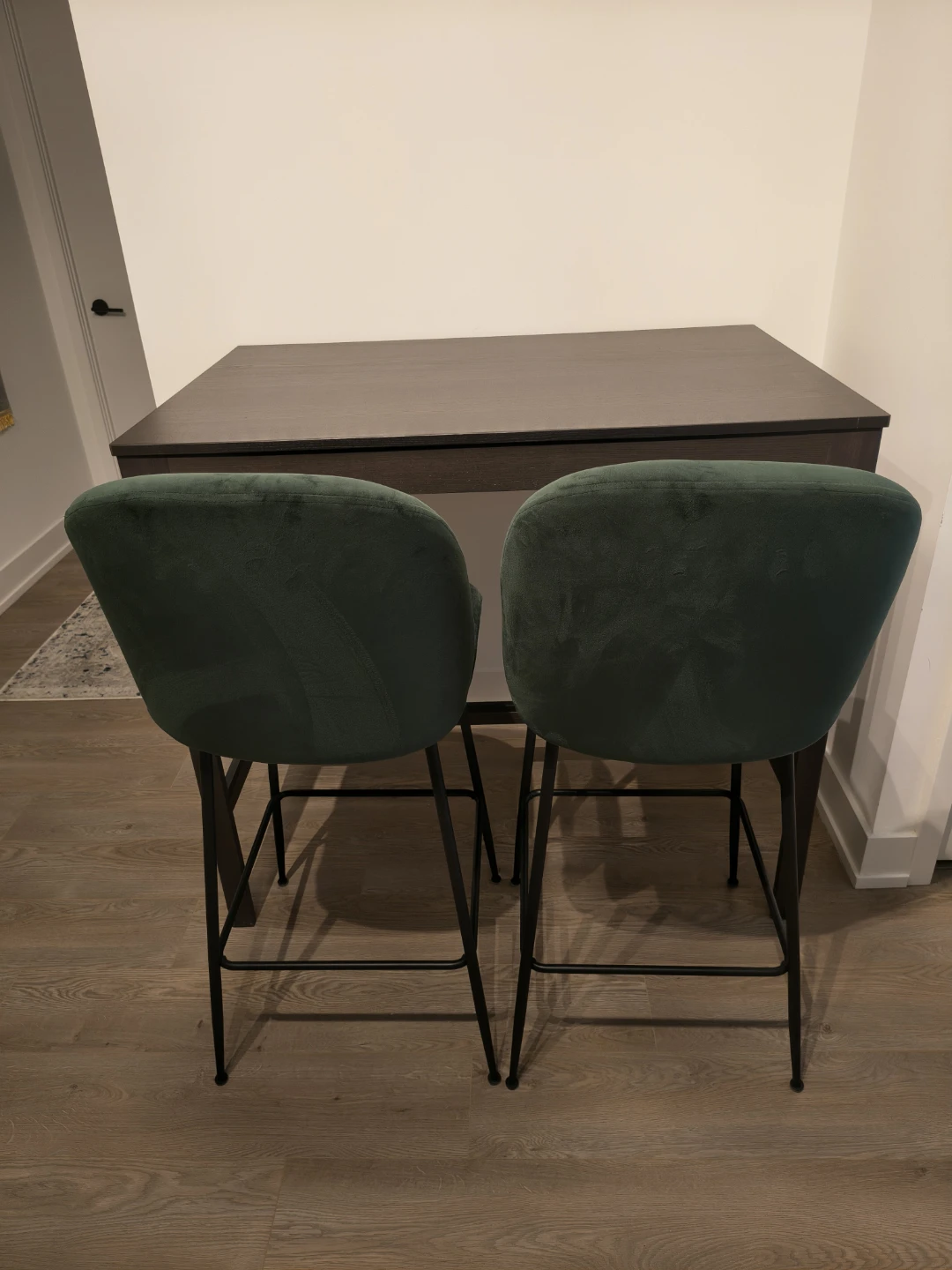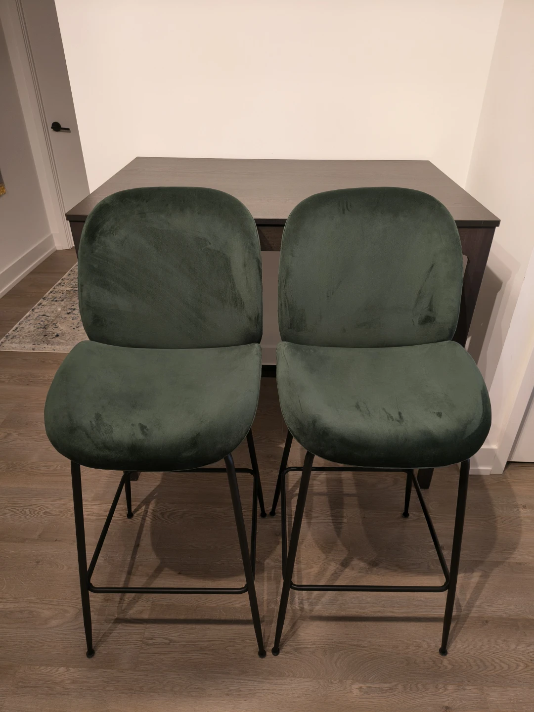 Selling a set of two stylish bar stools. They're a beautiful shade of green velvet and would be a great addition to any kitchen or bar area