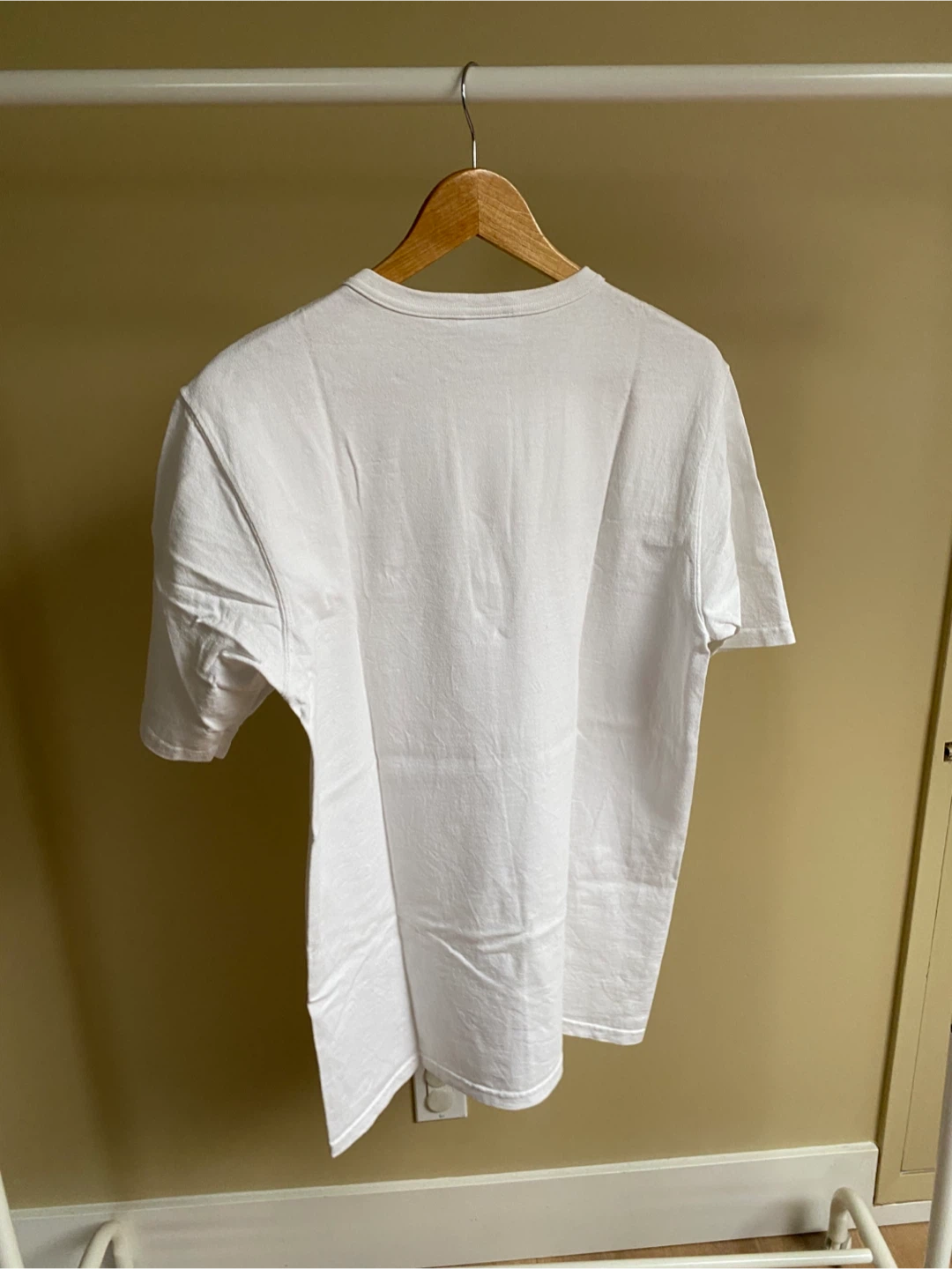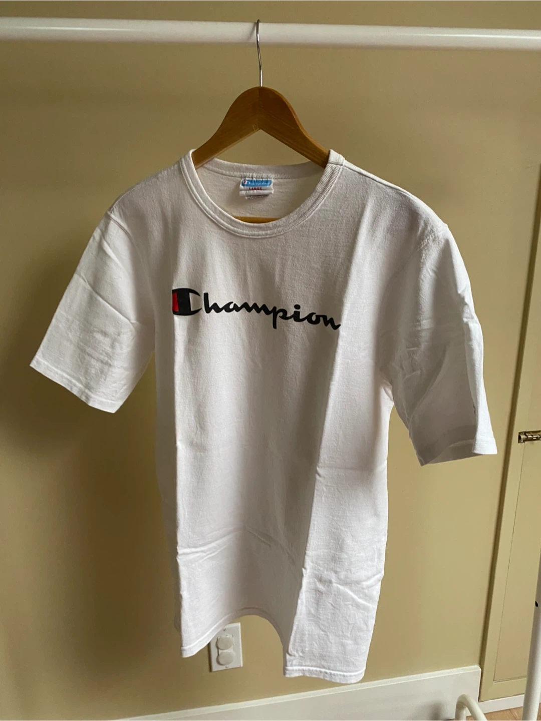 Selling a classic white Champion t-shirt in size large. It's in great condition and ready for a new home. Perfect for casual wear or layering!