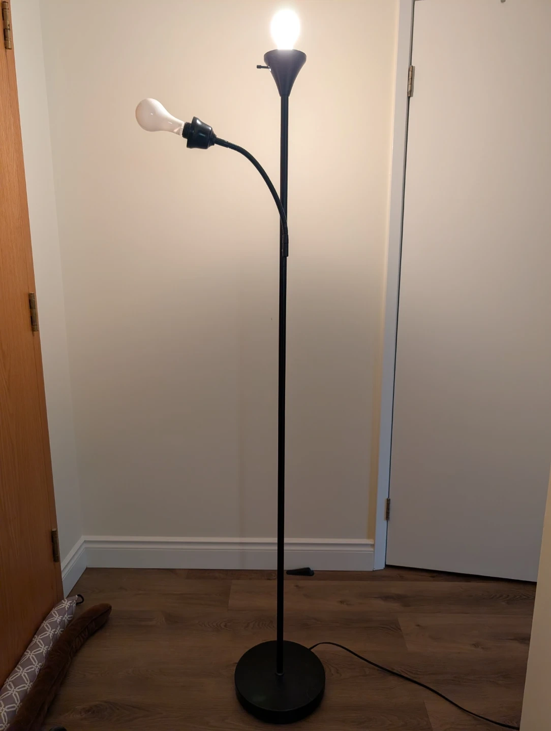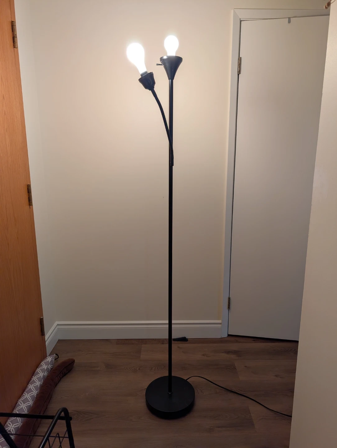 99Selling a black floor lamp in great condition! It has a sleek design and would look great in any room. It features two lights.