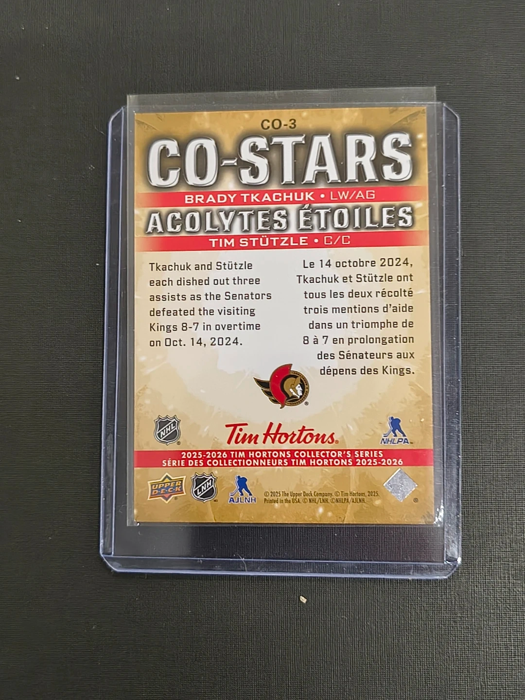 Selling a Tim Stützle Co-Stars trading card from Upper Deck's 2025 Tim Hortons Series. It features Brady Tkachuk as well! A great addition for any hockey card collector