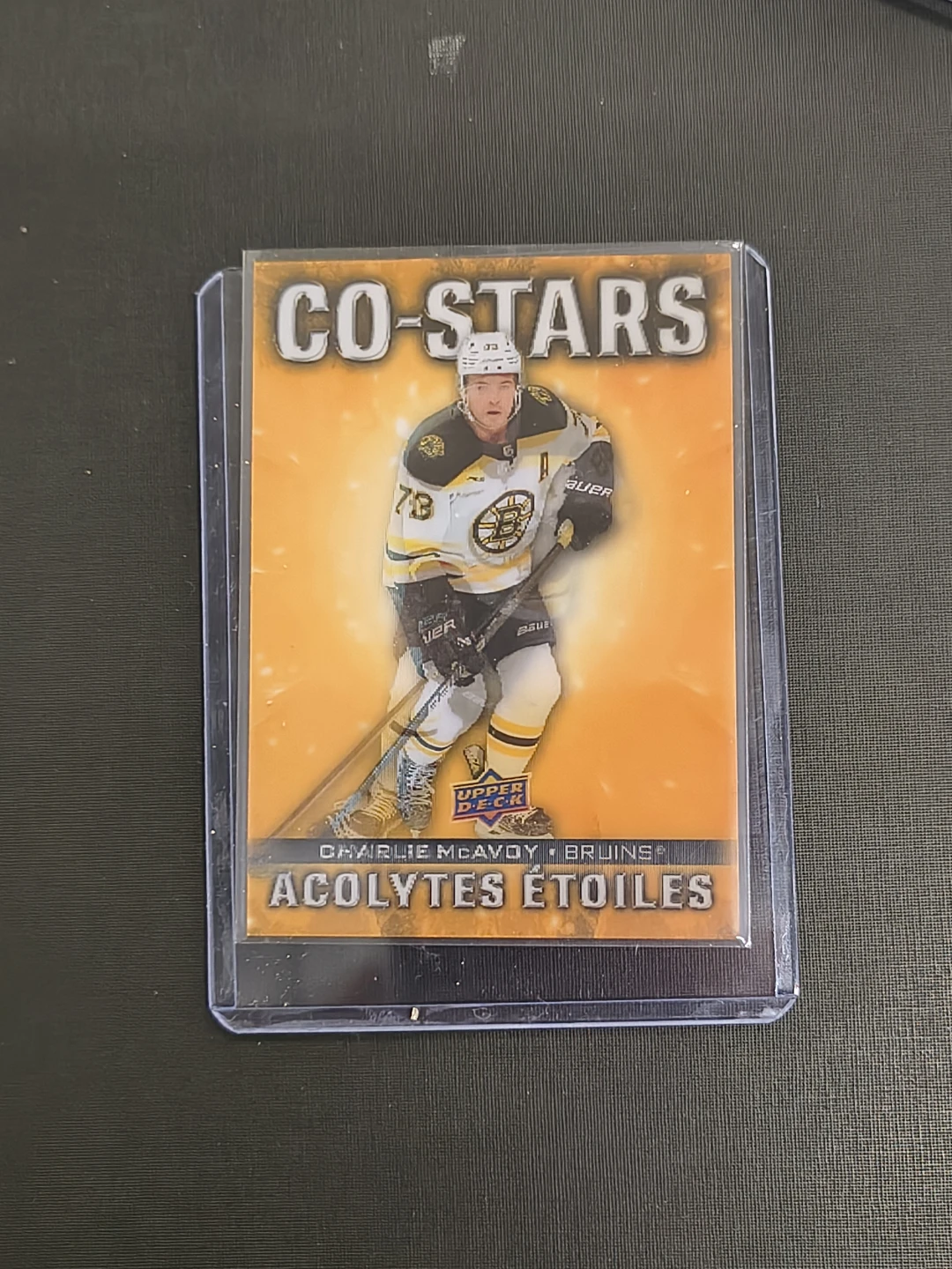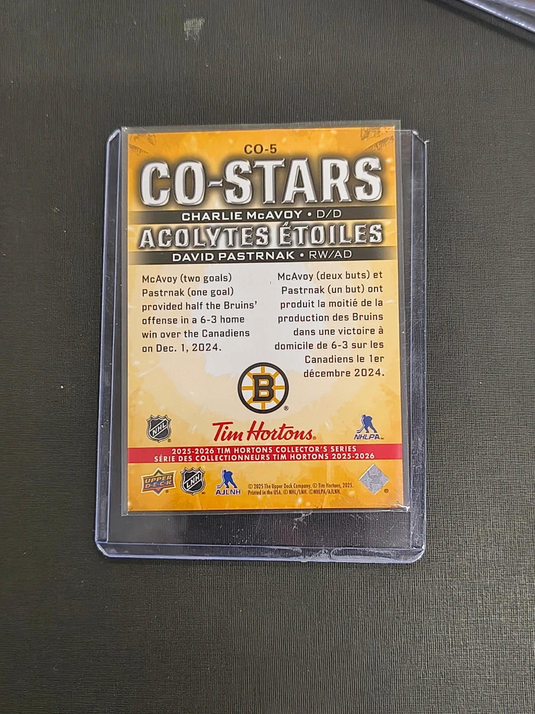Selling a Tim Hortons hockey card featuring Charlie McAvoy and David Pastrnak from the 2023-2024 collection! This card is from the Co-Stars series, specifically card CO.5. It highlights their performance in a 6-3 win over the Canadiens on December 1, 2024