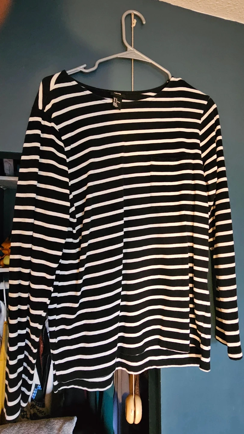 1000+Here's a cute striped long-sleeve top from H&M! It's a size medium and features a classic black and white stripe pattern. Perfect for layering or wearing on its own