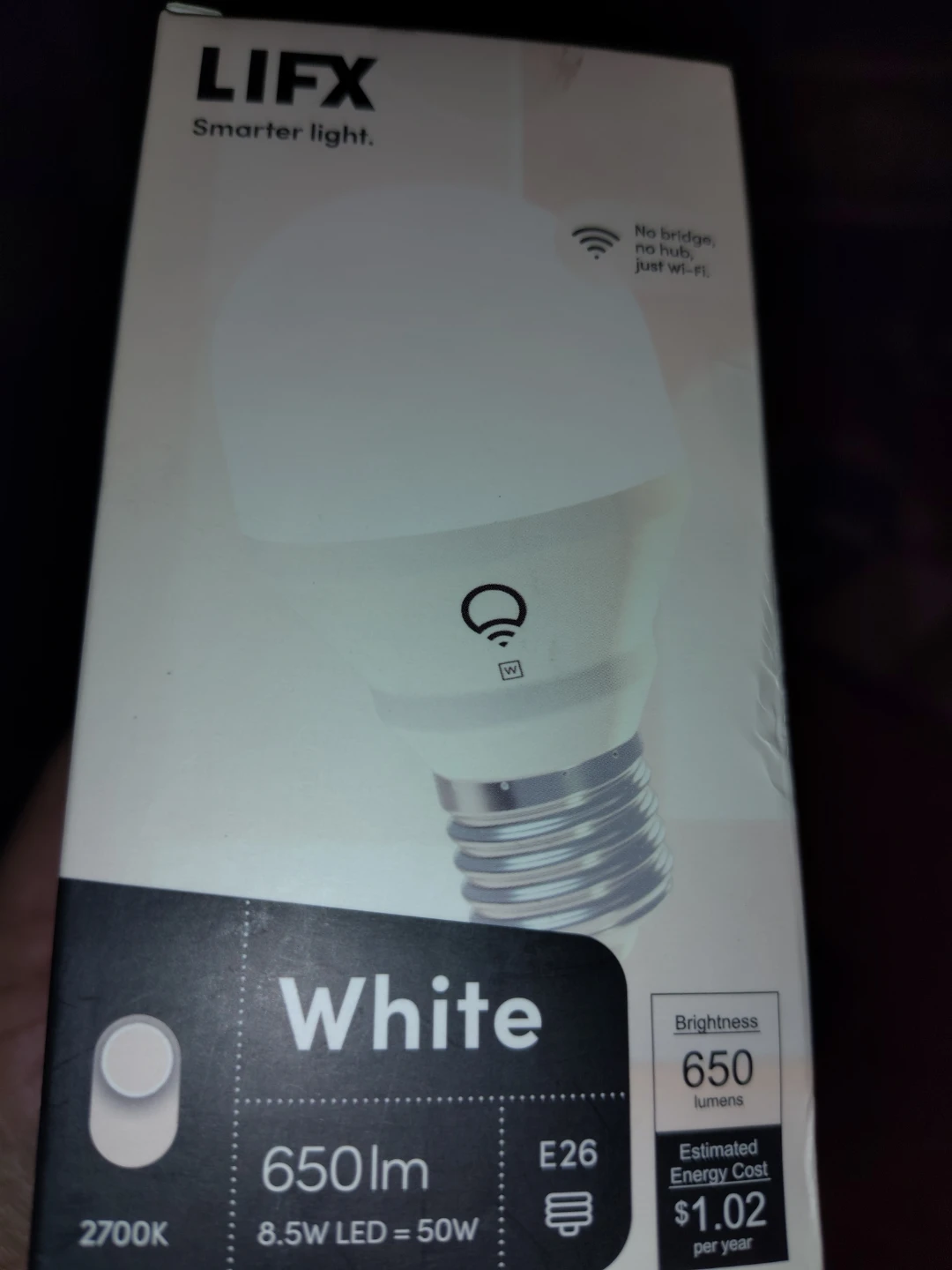 Selling a brand new LIFX White smart light bulb! It's super easy to set up, with no bridge or hub needed, just Wi-Fi. It has a brightness of 650 lumens and an estimated energy cost of only $1.02 per year. The bulb is 8.5W LED and is equivalent to 50W. It's also 2700K, so it gives off a nice warm light.