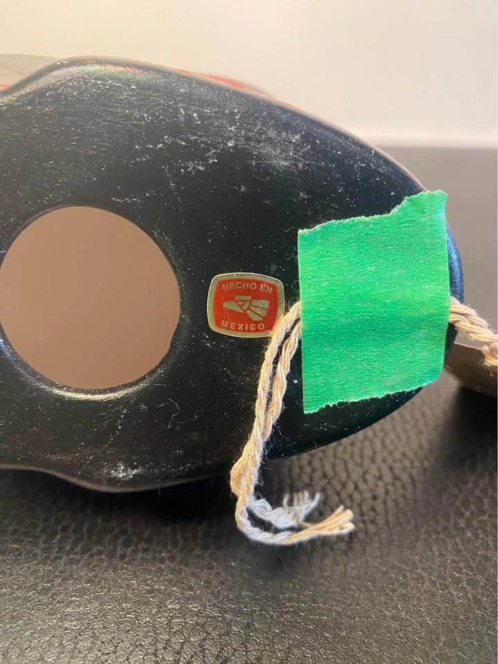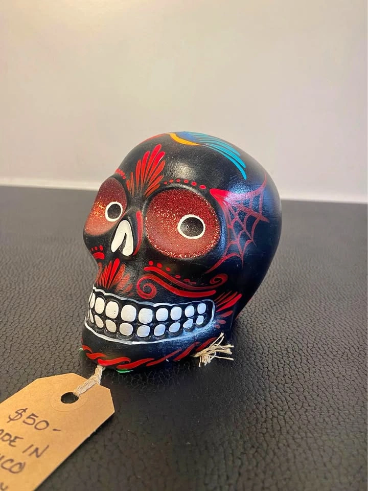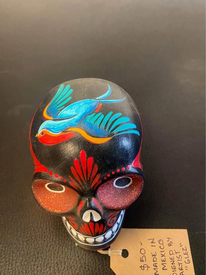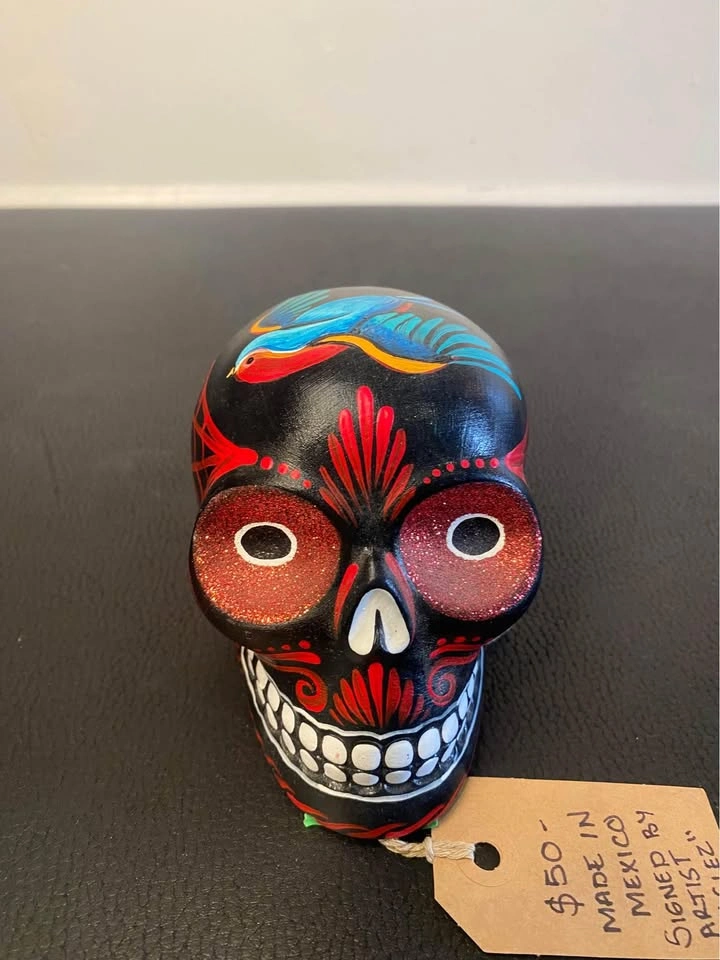 The detailed hand-painting brings depth and vibrancy to the piece, while the glitter adds a subtle sparkle that catches the eye. Perfect for collectors or anyone looking to add authentic Mexican cultural art to their decor, this unique skull combines tradition with contemporary tattoo artistry. In excellent condition, it’s ready to enhance any space with its bold, meaningful presence.