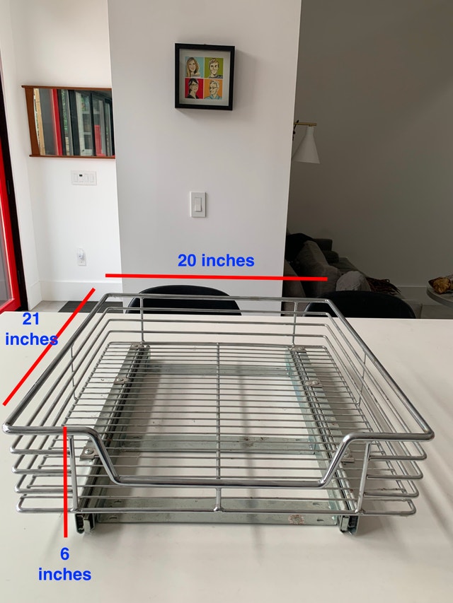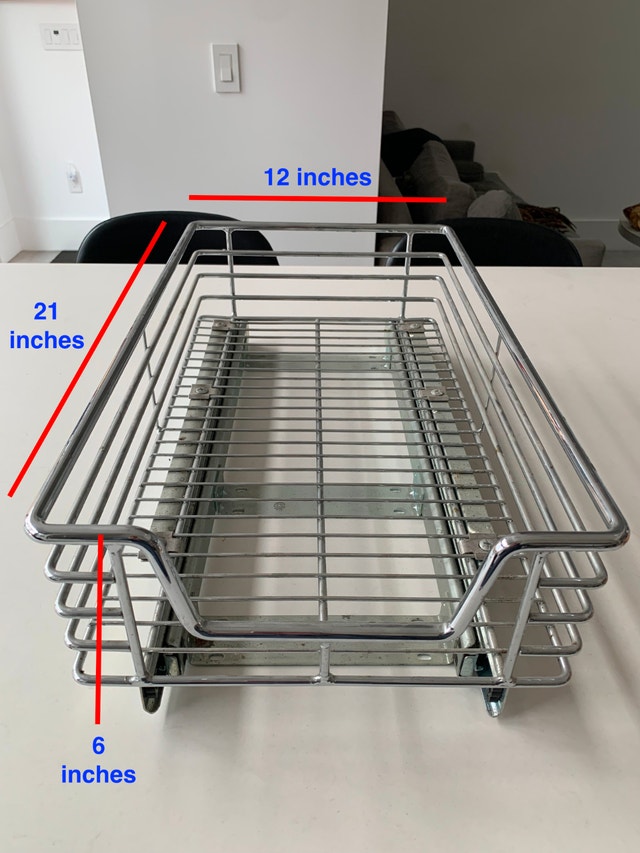 Up for grabs–2 four-sided heavy duty pull-out drawers with bottom-mount full-extension ball-bearing slides. They can be easily installed inside kitchen cabinets. Install by screwing them onto the top surface of a cabinet shelf. Drawers pull out smoothly. Drawer fronts have a dropped rim for easy access. Small drawer: Width - side to side: 12 inches Depth - front to back: 21 inches Height - bottom to top: 6 inches Large drawer: Width - side to side: 20 inches Depth - front to back: 21 inches Height - bottom to top: 6 inches $75 for both OBO
