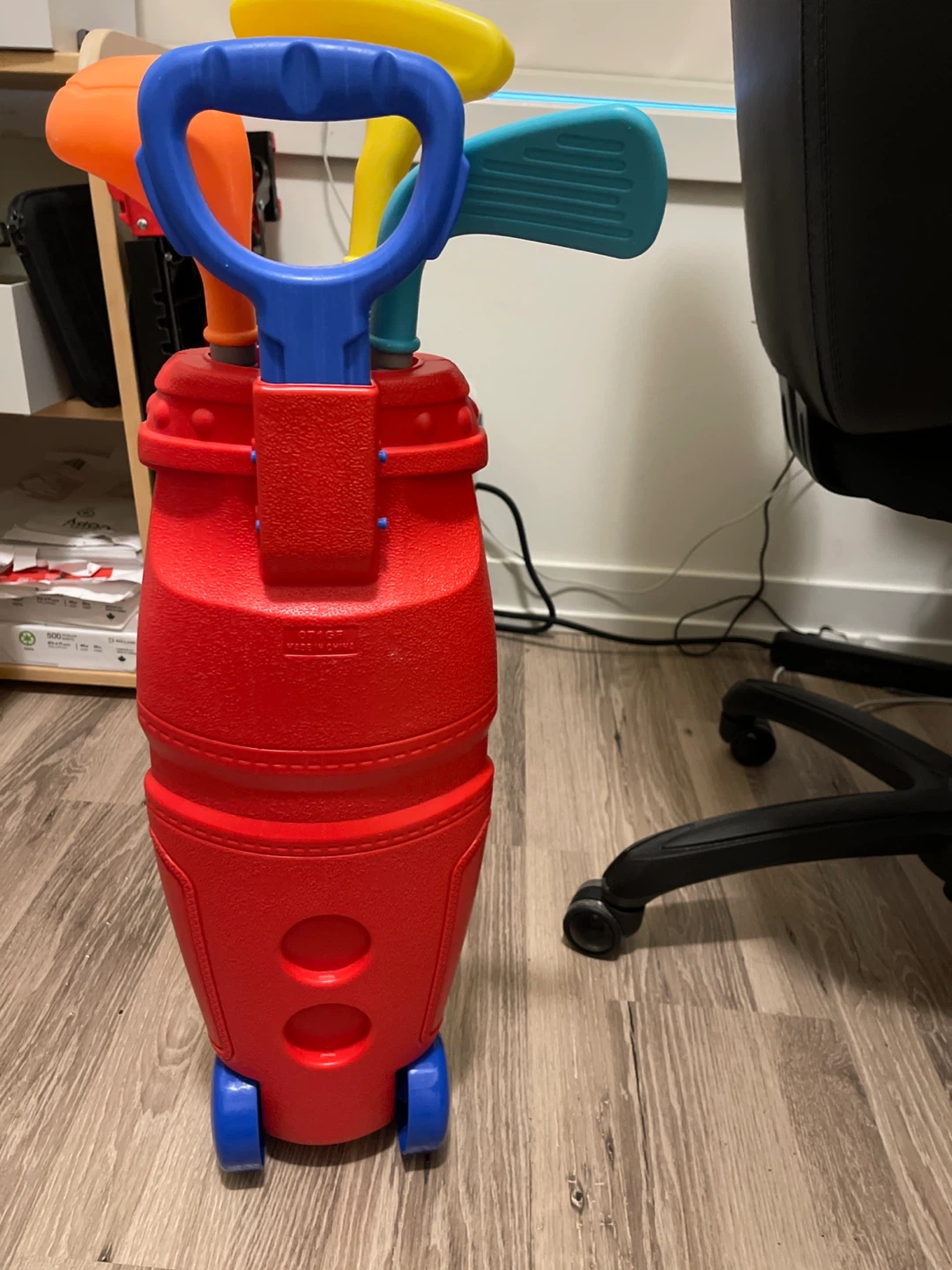 This is a fun toy golf set for kids! It includes a red golf bag with wheels and several colourful golf clubs. Perfect for little ones who are just starting to explore the game of golf