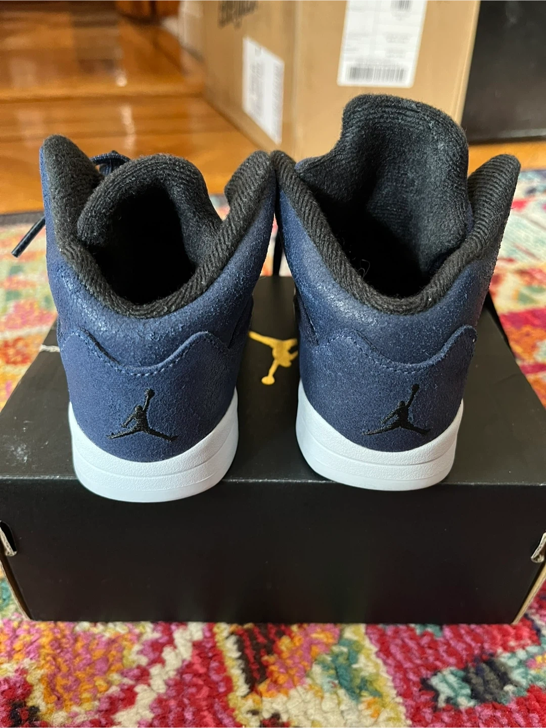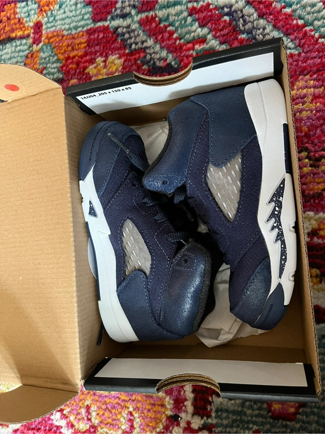 These are a pair of Jordan 5 Retro infant shoes in navy blue. They come with the original box. These shoes are super cute and stylish for your little one! Never worn!