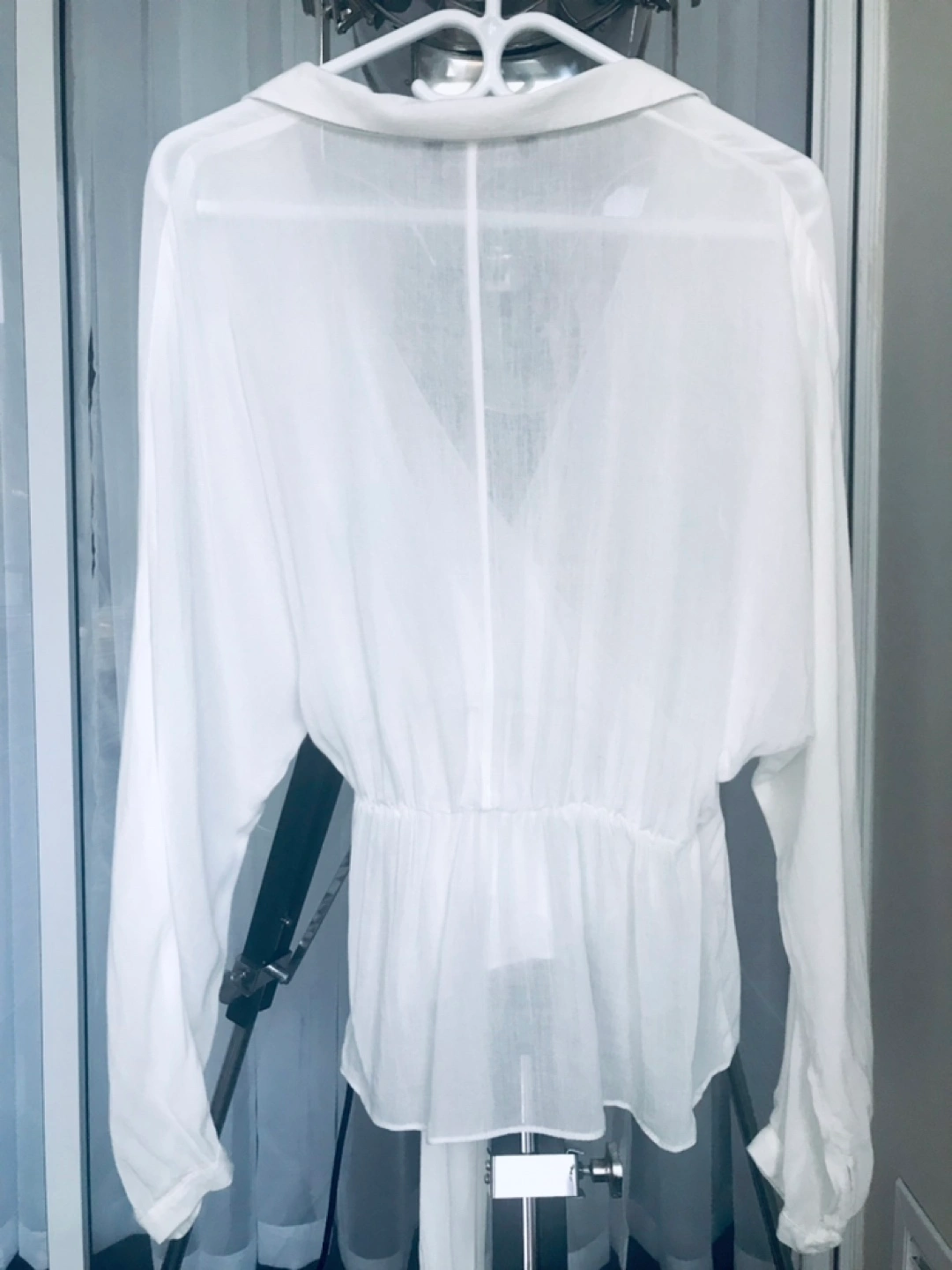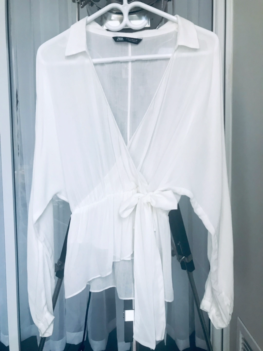 Zara Women’s white gauzy viscose fabric, tie front, elasticised waistband with peplum, never worn, size XS-S