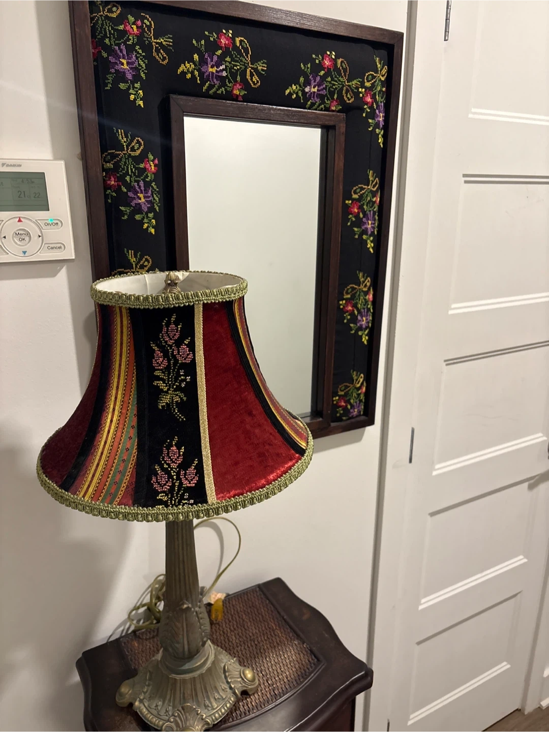 Selling a unique mirror and lamp set. The mirror features a dark wooden frame with beautiful floral embroidery. The lamp has a red and black shade, also with embroidered details.