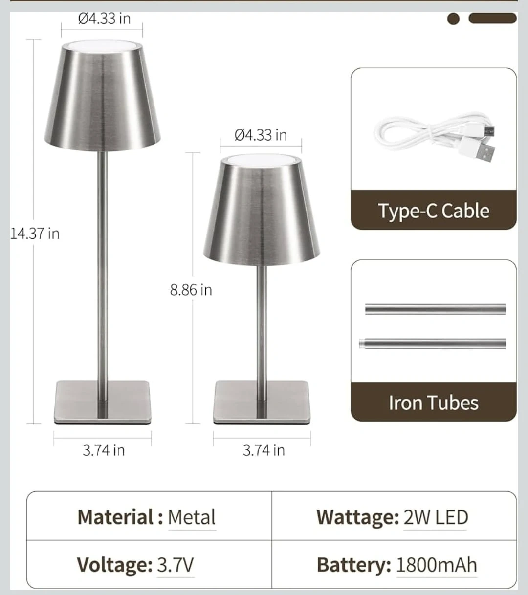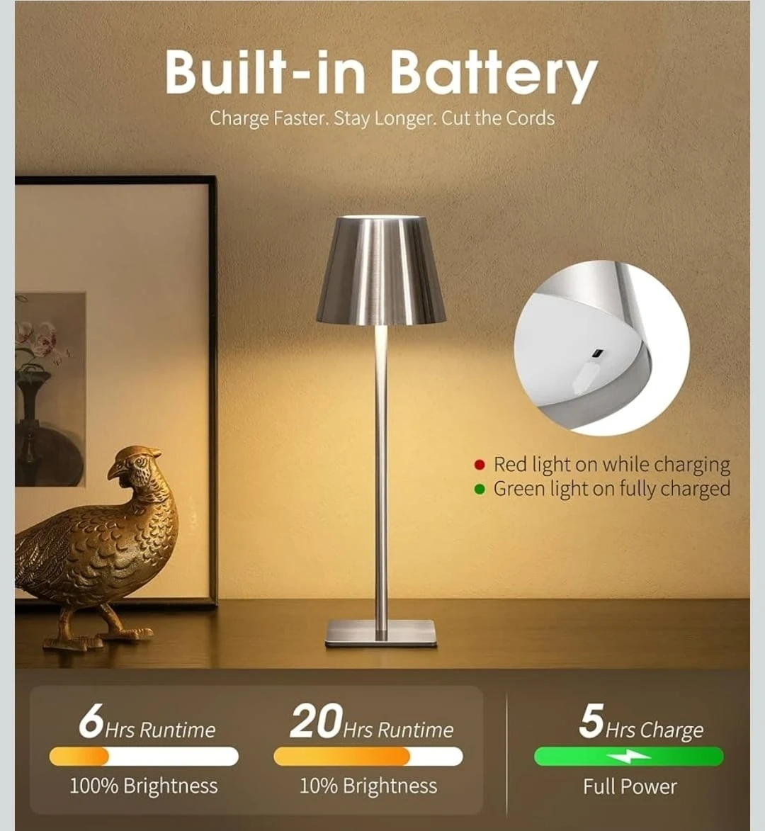 This sleek, silver metal cordless table lamp is perfect for adding a touch of modern elegance to any space! It's weather-resistant, making it suitable for both indoor and outdoor use. The built-in battery offers long runtime, and it comes with a Type-C cable for easy charging.