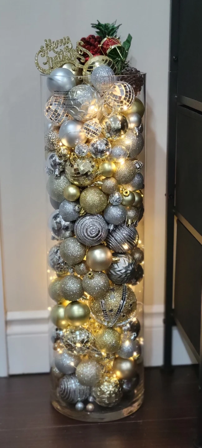 I'm selling a vase filled with beautiful Christmas ornaments! It's decorated with silver and gold ornaments and lights to add a festive touch to your home. Perfect for the holidays! Also makes a great gift