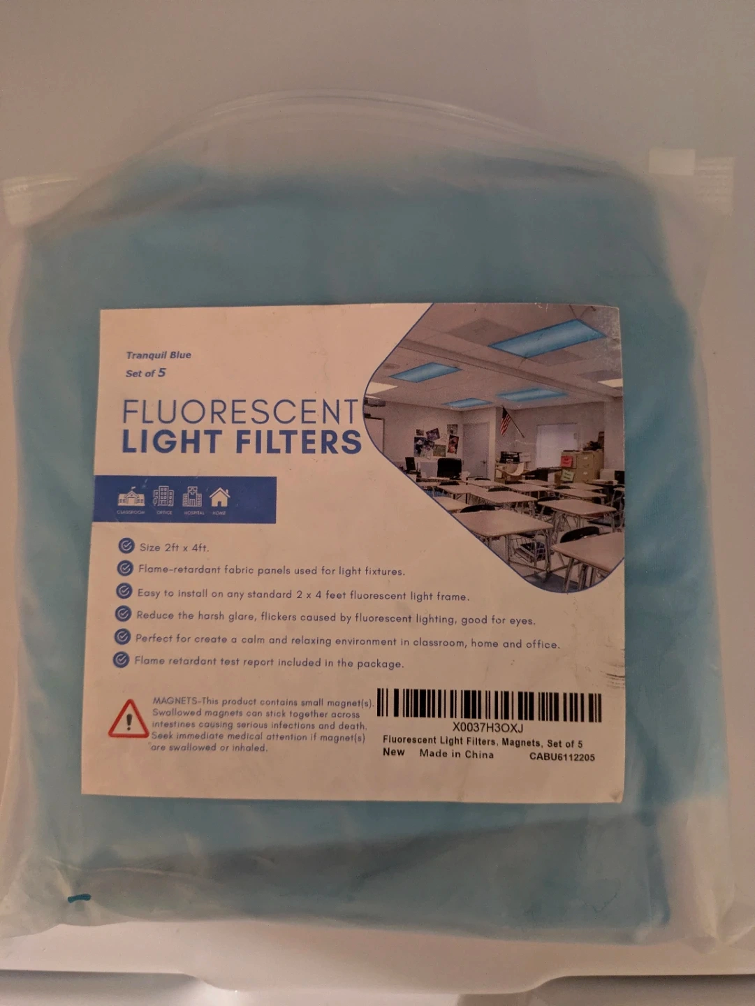 397Selling a set of Tranquil Blue Fluorescent Light Filters. 5 pieces. Brand new in box (bag). They're easy put up (and take down) on any standard 2' x 4' fluorescent light frame via 10 magnets sewn into each fabric filter.These filters reduce harsh glare and help create a calm and relaxing environment. Help minimize headaches and migraines caused by harsh overhead lights. Fabric is heat tested (certificate of testing include inside the packaging). Perfect for classroom, home and office use. Never used. Only took one out of package to take photos for listing. $93 on Amazon (more on educational resources and other sites). Don Mills and Finch condo lobby pickup cash only