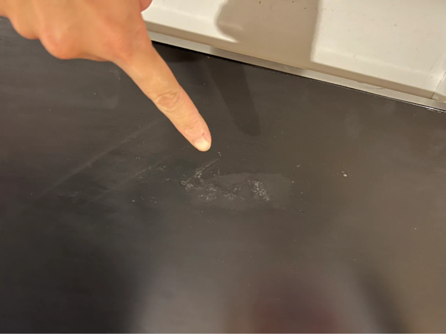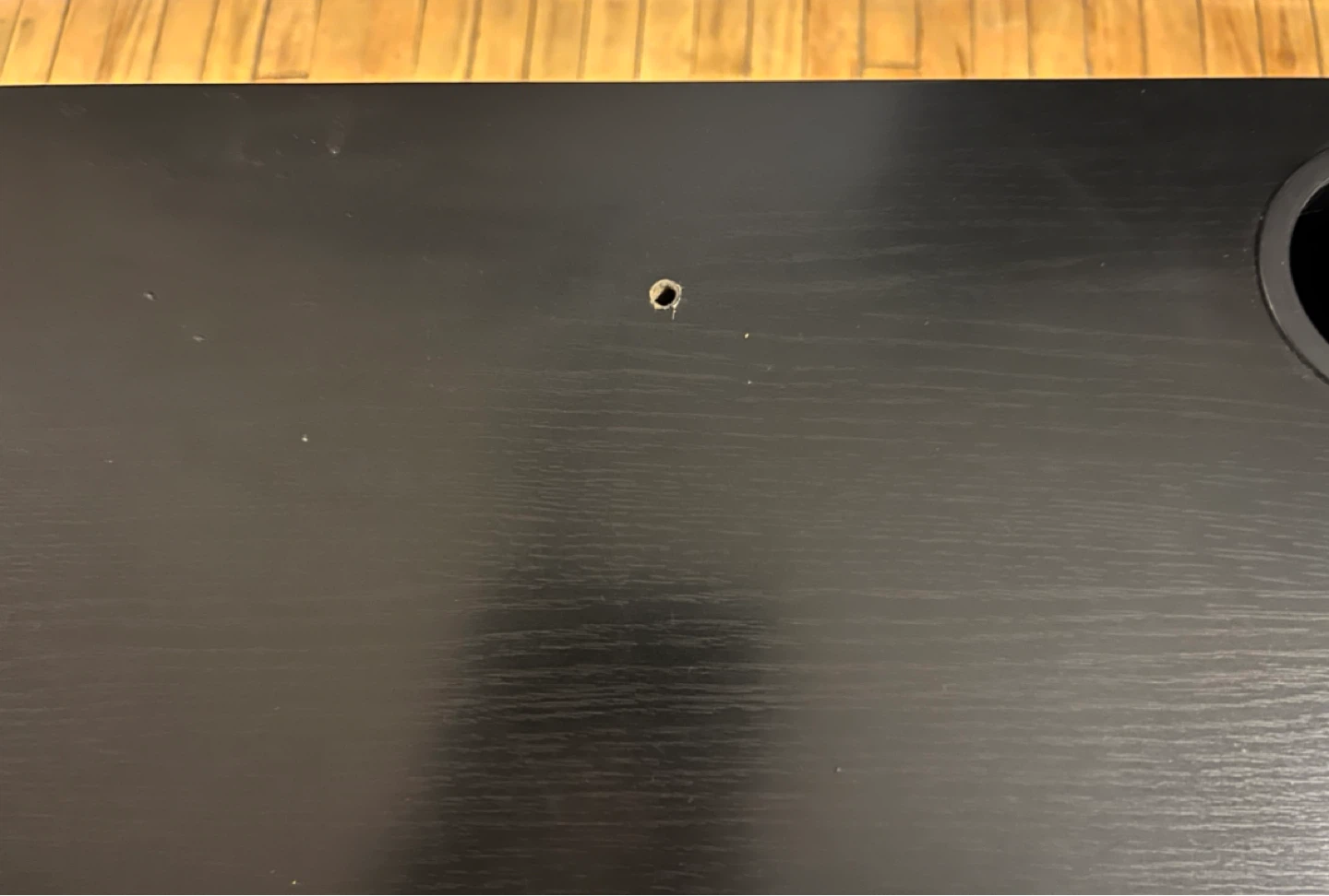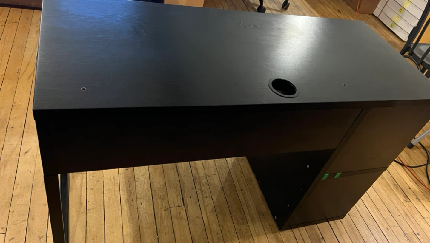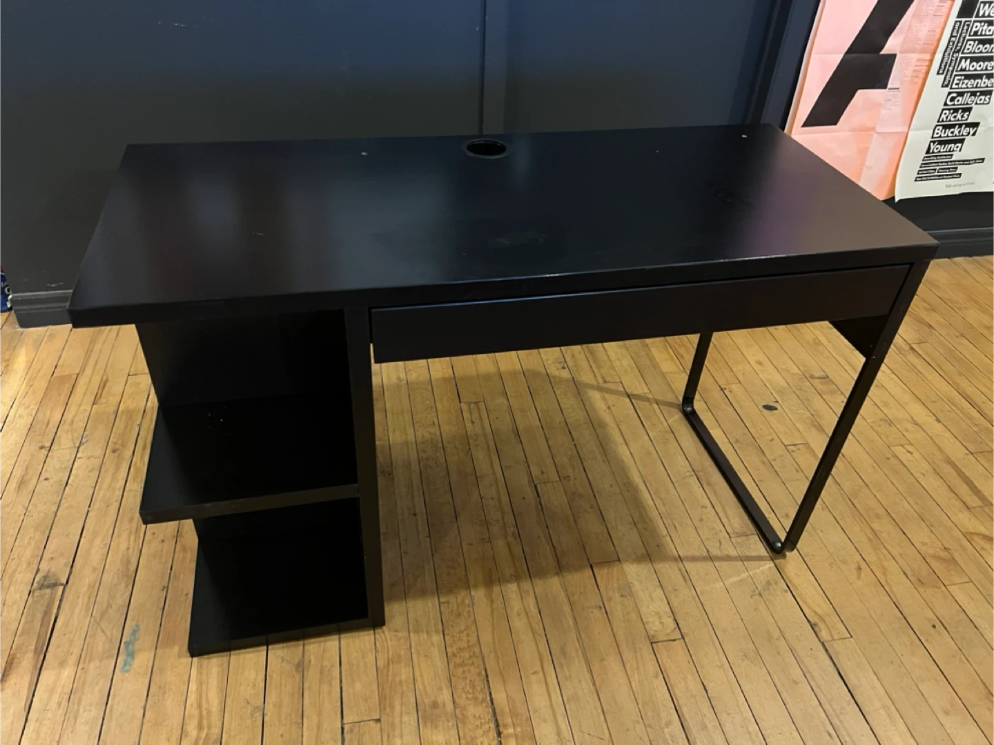 Black IKEA Micke desk with integrated storage shelves. The desk has a drawer and shelving on one side. It measures approximately 48 inches in length and 20 inches in depth. Top had some scrapes so it was sanded down and then spray painted over, you can see it up close but not a big deal if you’re just looking for a cheap desk.