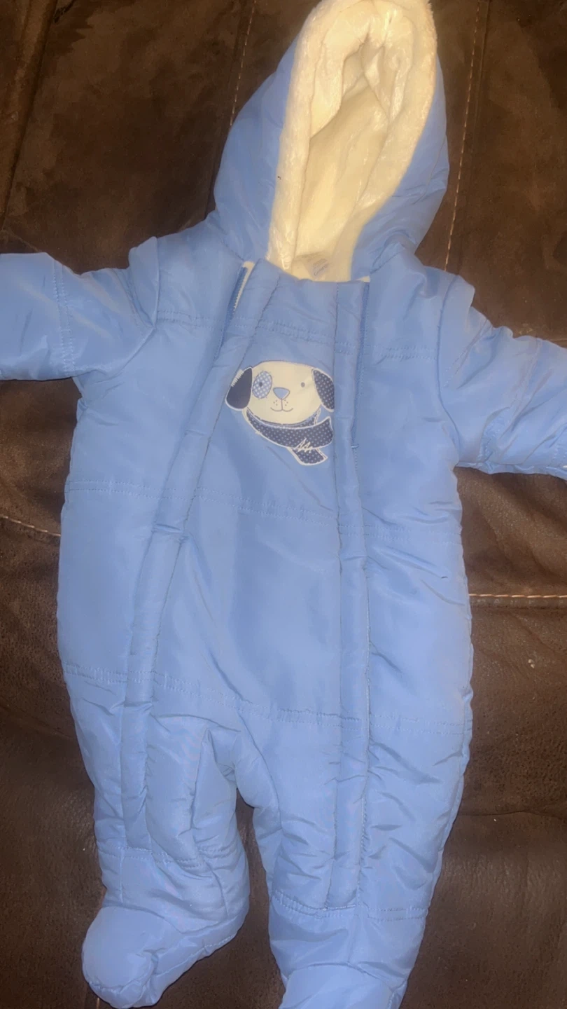 A super cute baby blue snowsuit, perfect for keeping your little one warm this winter! Never used! It's sized 0-3 months and features a soft, plush lining. The outer shell is 100% polyester, while the lining is 100% polyester as well