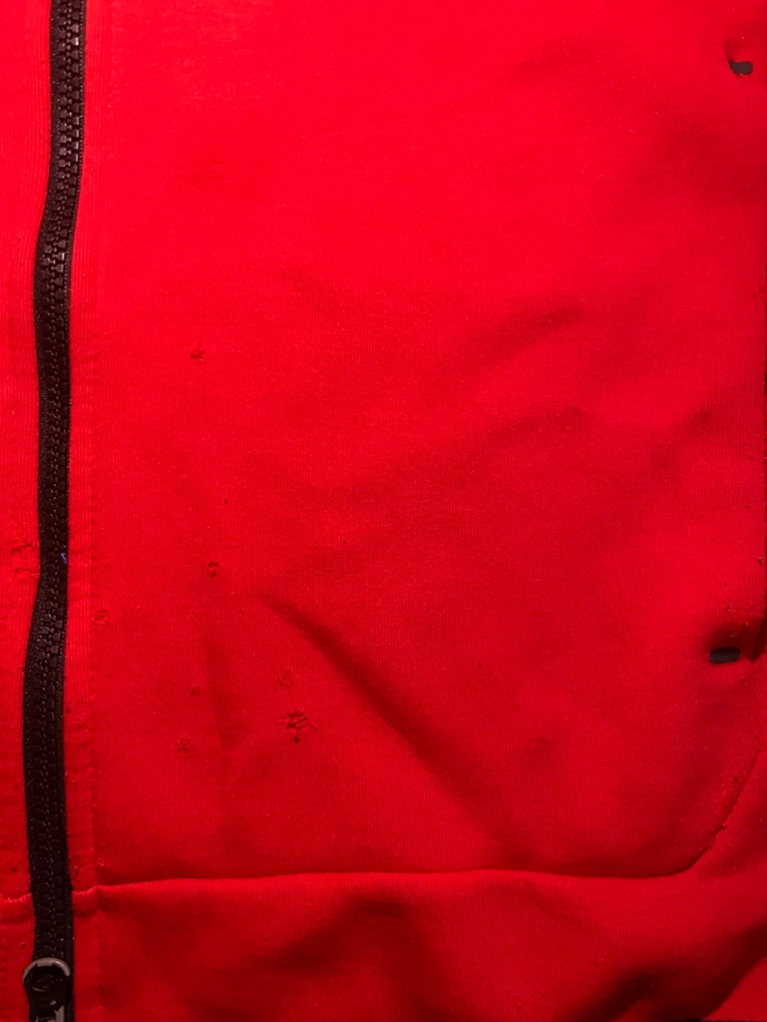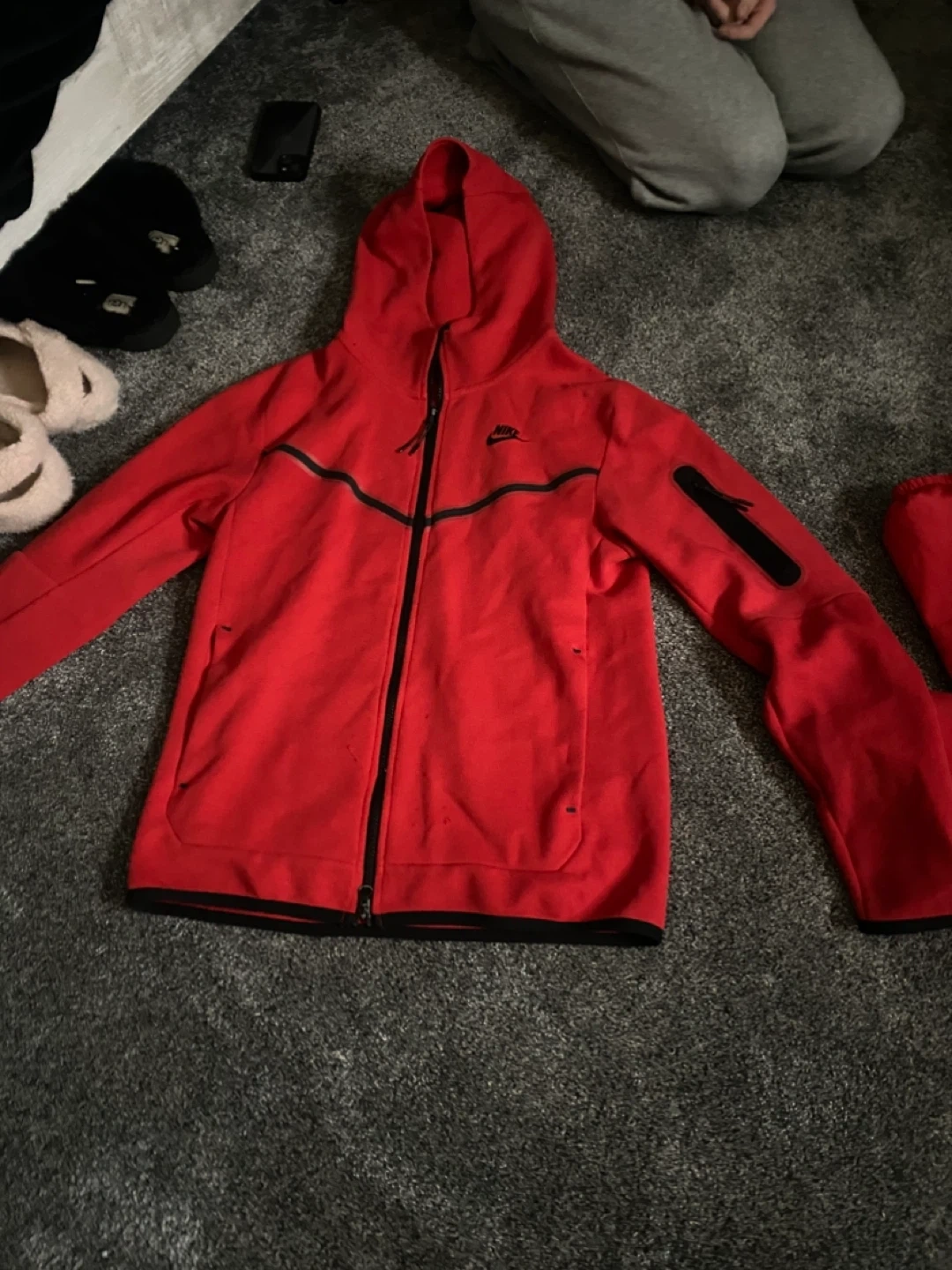 Selling a red Nike Tech Fleece hoodie. It's a size small. There are a few small snags on the front of the hoodie.