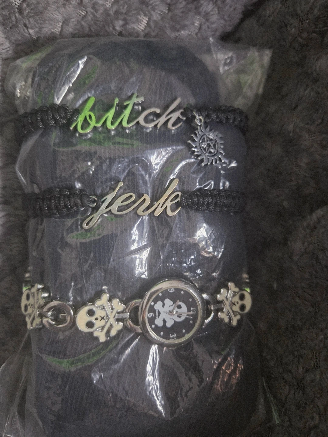 The set includes two bracelets with the words 'bitch' and 'jerk' on them, plus a charm with the anti-possession symbol. Also included is a watch-style bracelet with skull and crossbones charms. (Needs battery)
