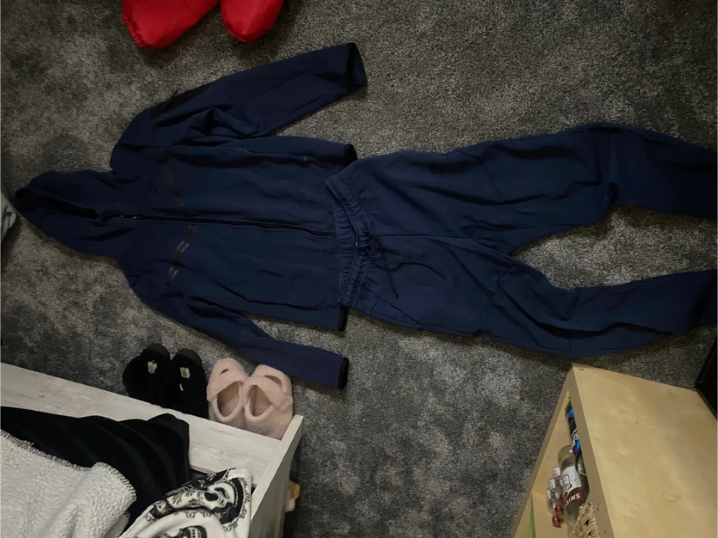 Selling a navy blue Nike tech tracksuit in size small. It's a comfy and stylish set, perfect for workouts or just lounging around. The material is soft and durable, ensuring long-lasting wear. Great for anyone needing a reliable and versatile outfit!