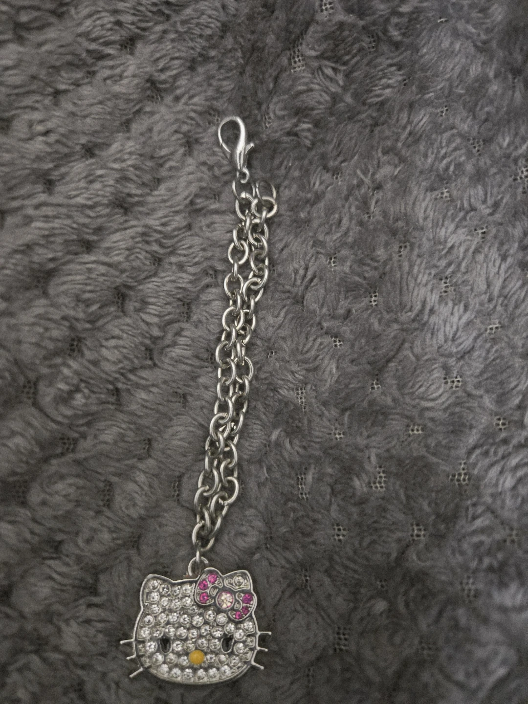 Giving away a cute Hello Kitty charm! It features a silver chain and a Hello Kitty pendant covered in rhinestones. Perfect for adding a touch of sparkle to your accessories.