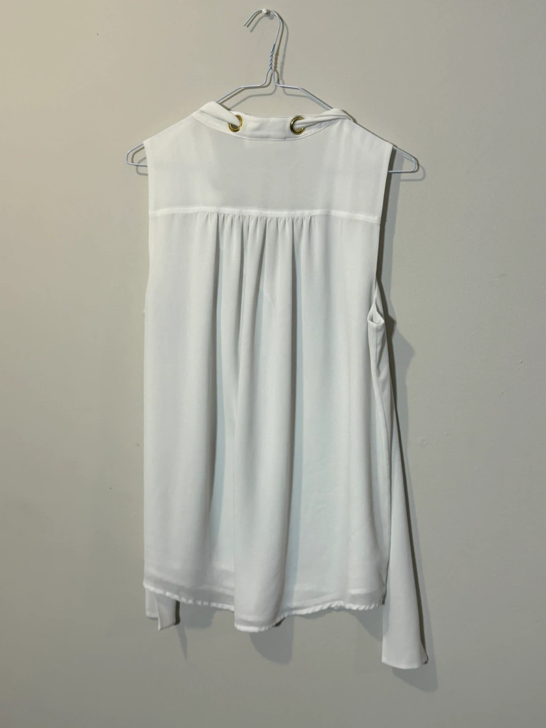 5Selling a Michael Kors sleeveless blouse in white. It's a size medium and in great condition! The material is lightweight and flowy, perfect for warmer weather. Has a unique tie detail at the neckline, which can be tied up