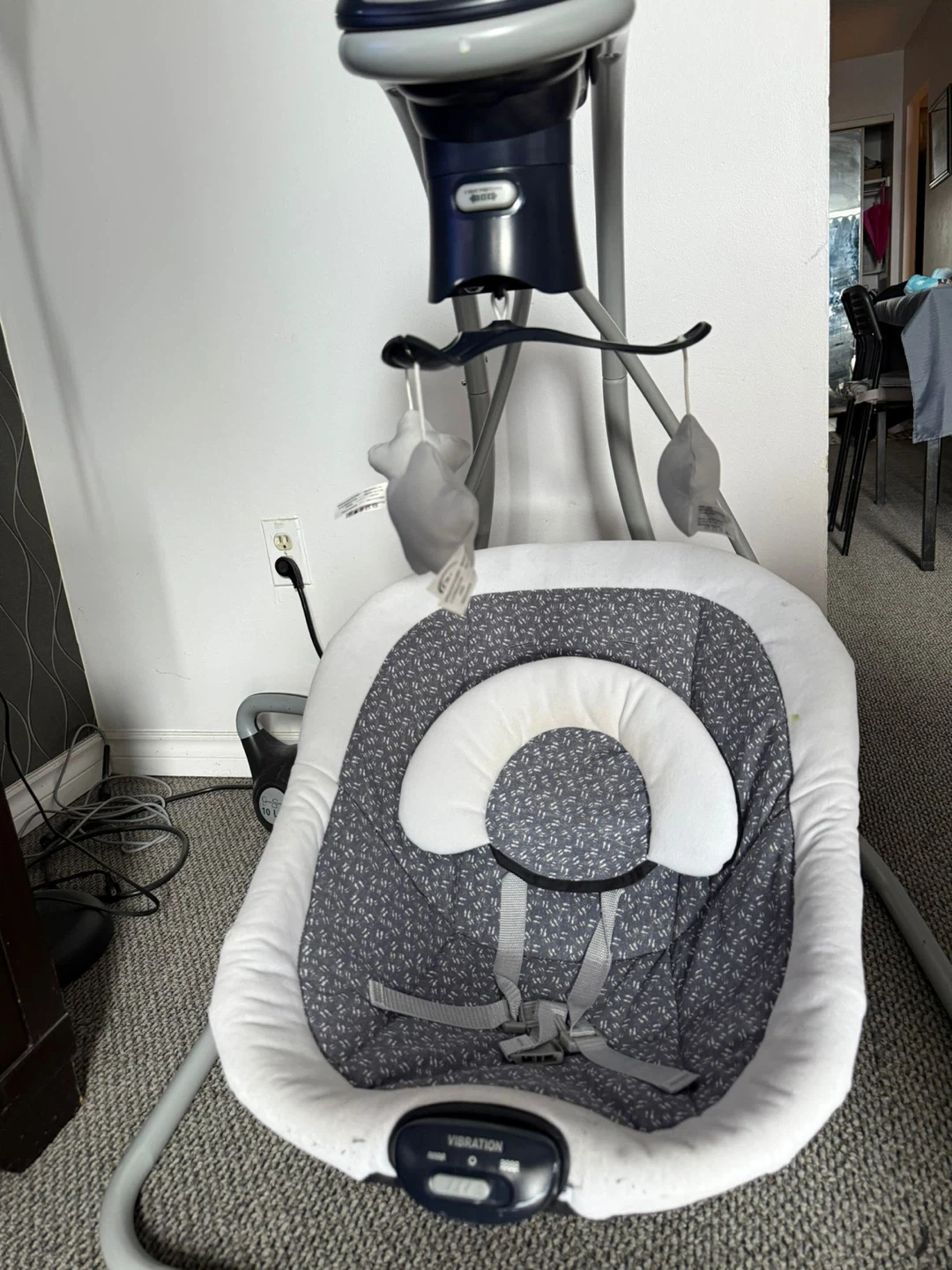 Selling a gently used Graco baby swing! It's in great condition and ready for a new little one. This swing has a variety of settings and features to keep your baby comfortable and entertained. It has vibration settings and hanging toys for visual stimulation