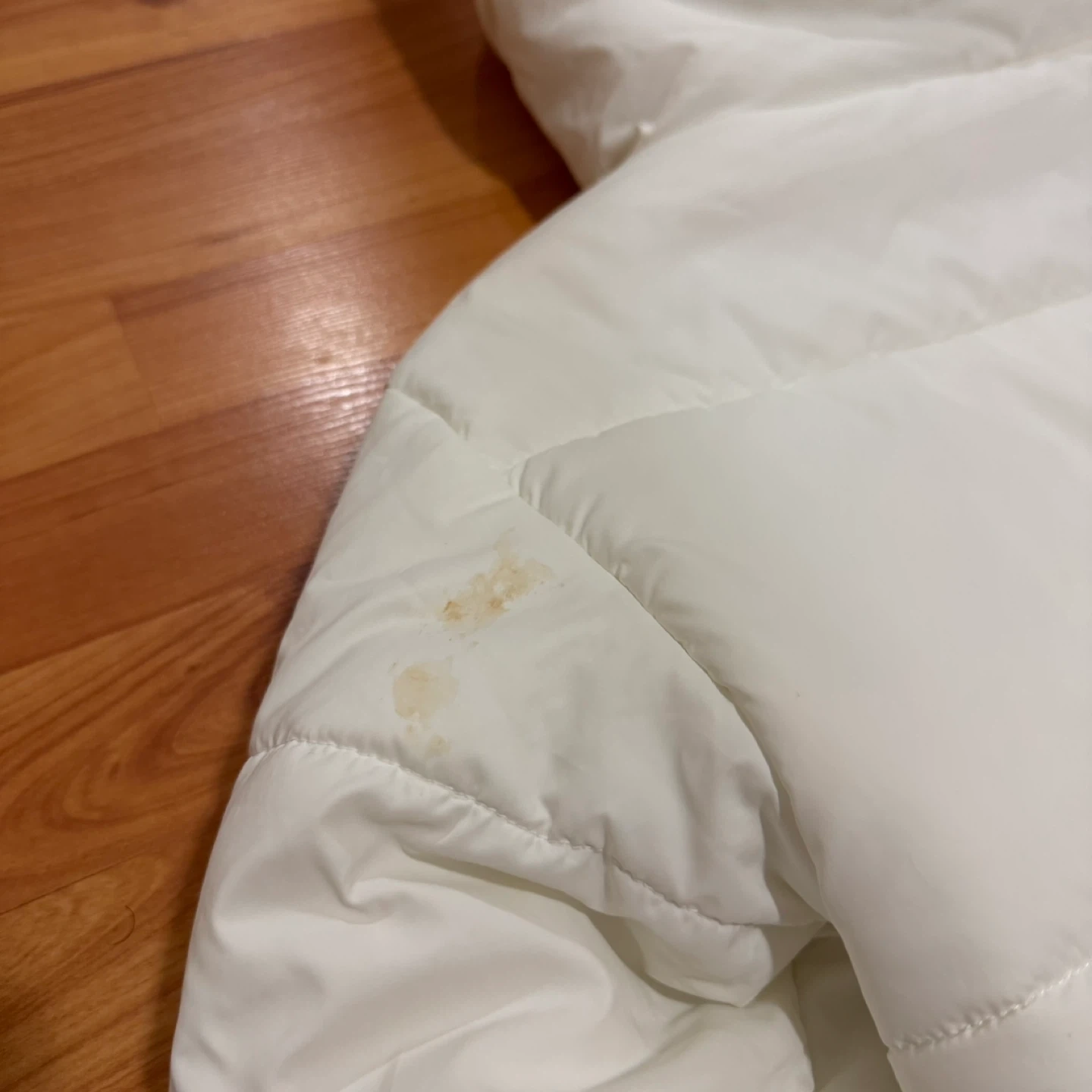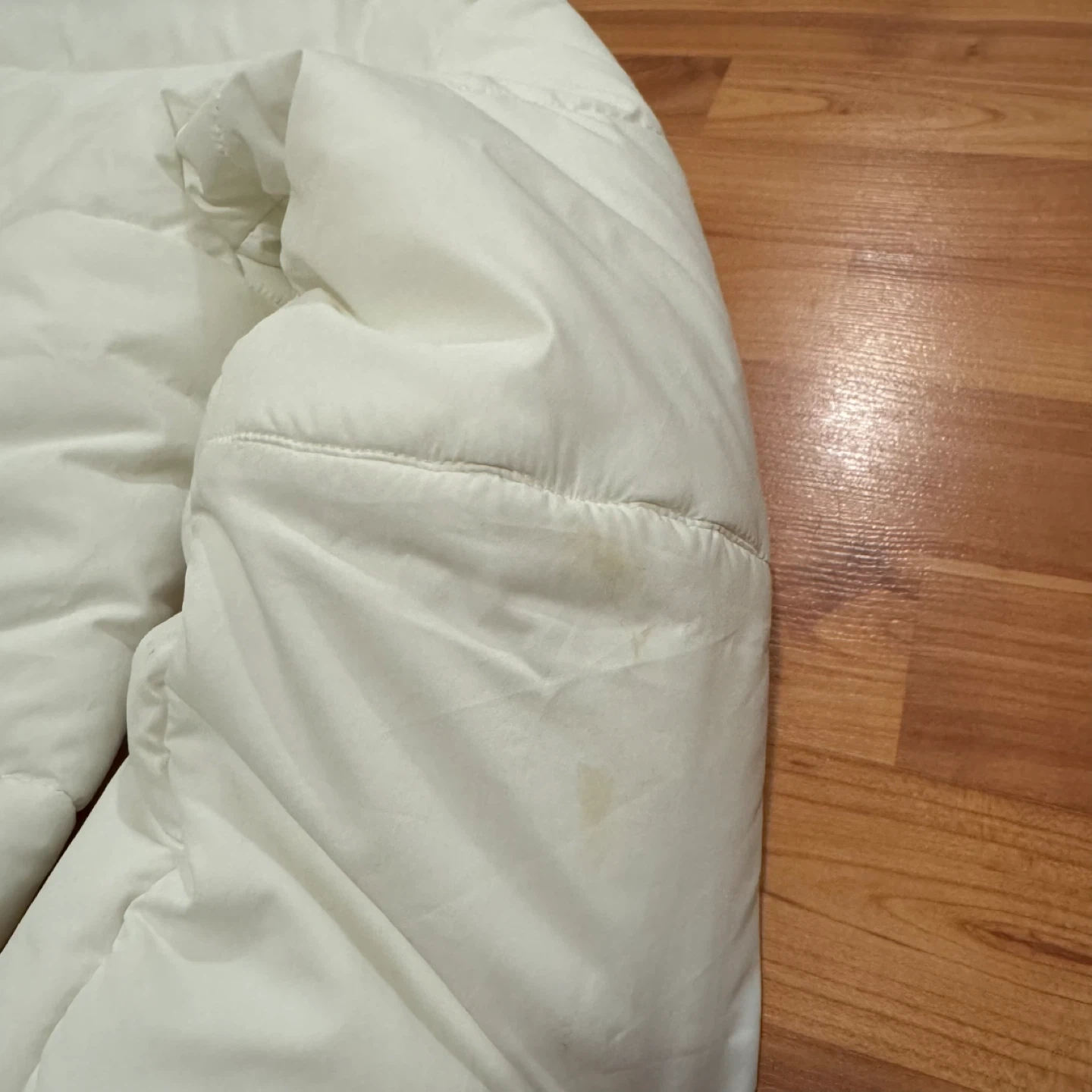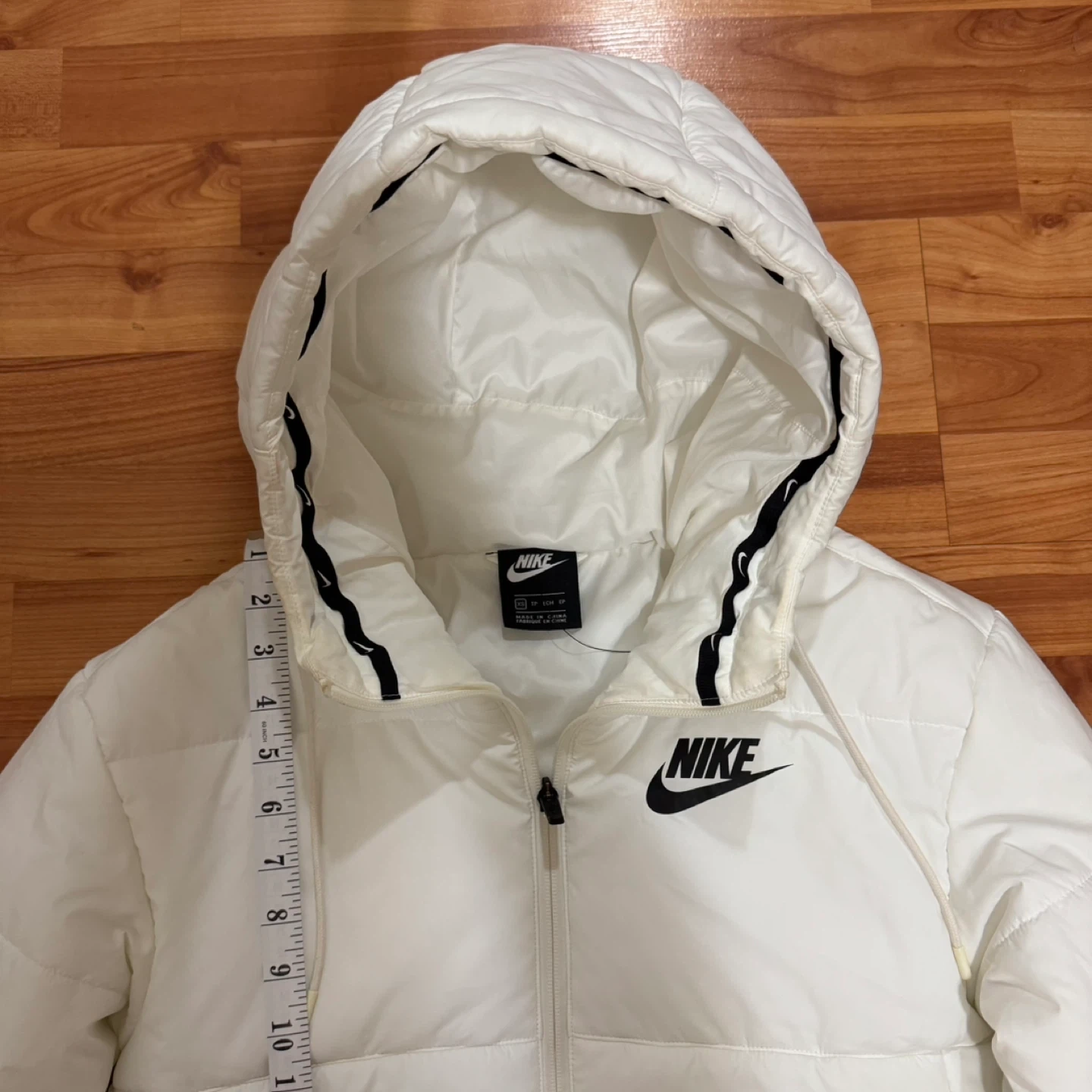 Lightly used white Nike puffer jacket. Size XS womens. It has a hood and a black and white Nike logo detail at the bottom. There are some washable stains on the sleeves and the back, as shown in the photos. Otherwise in good condition.