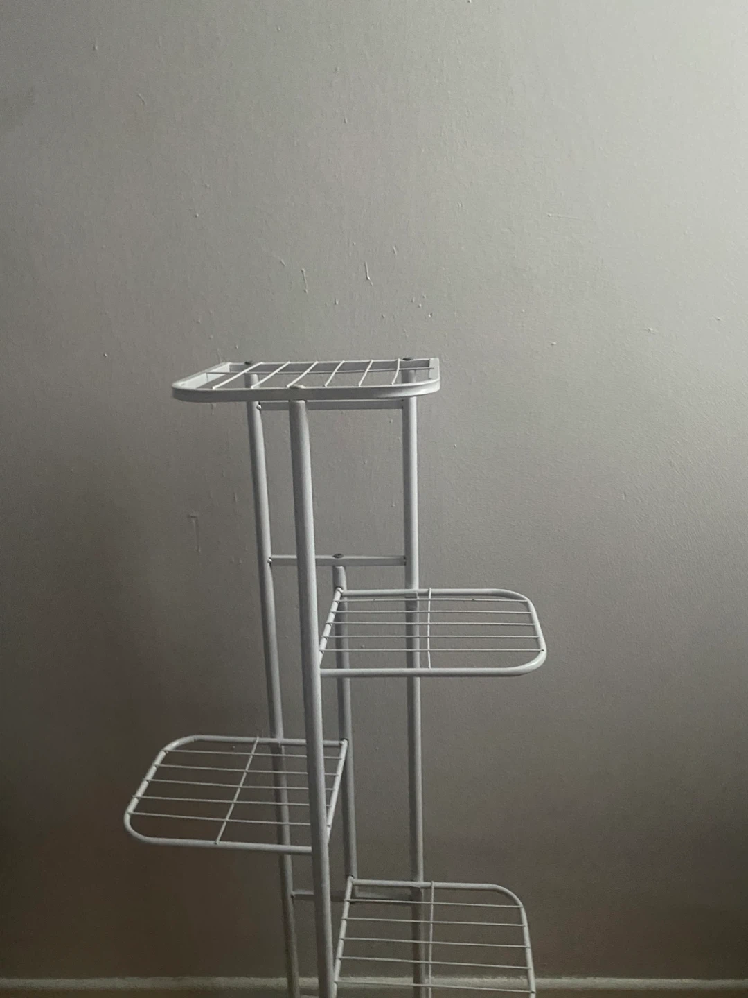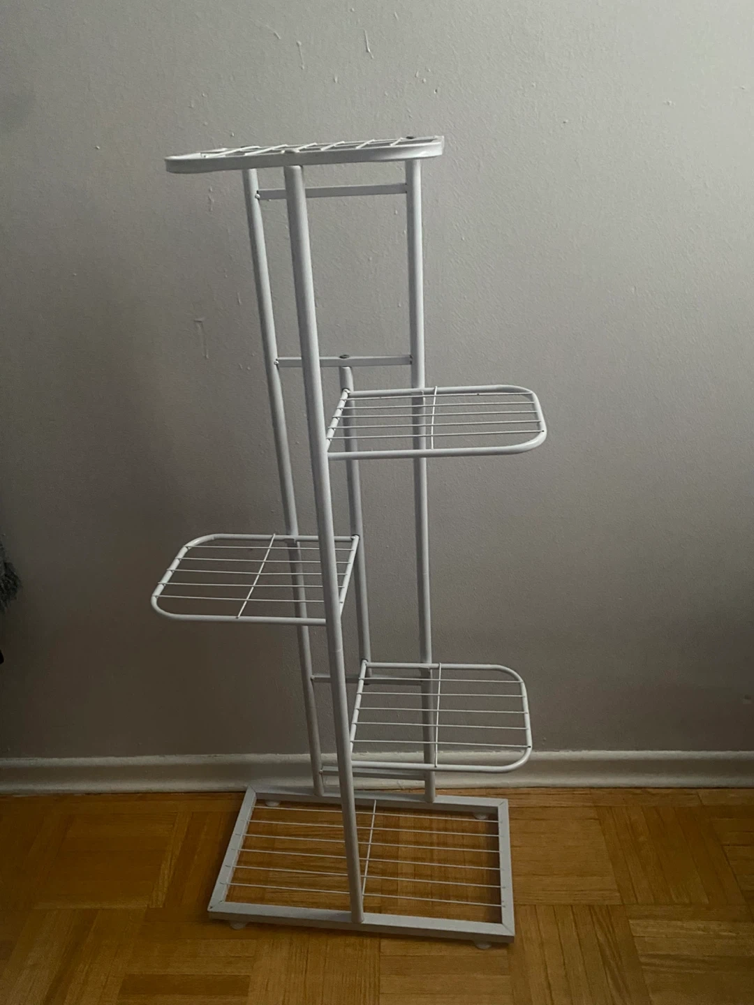 Selling a white metal plant stand, perfect for displaying your favourite plants indoors! It has multiple tiers, allowing you to showcase a variety of plants at different heights. It's in great condition and ready to brighten up your space
